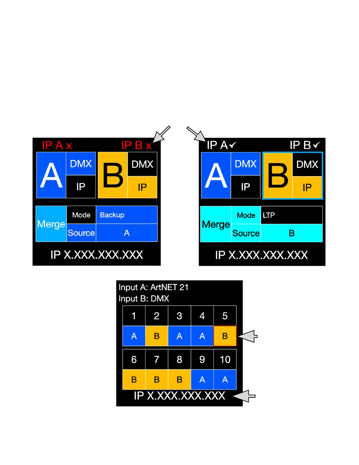 IP A / B: White text with a check mark indicates if a network port is