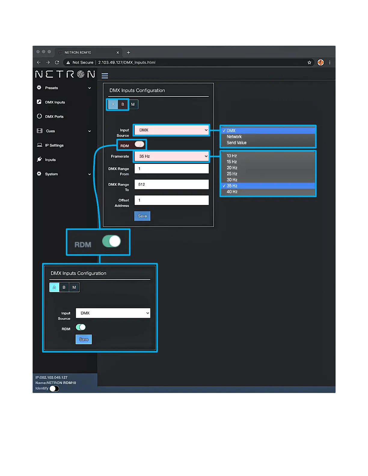 WEB REMOTE MENU: DMX INPUTS A & B DMX
