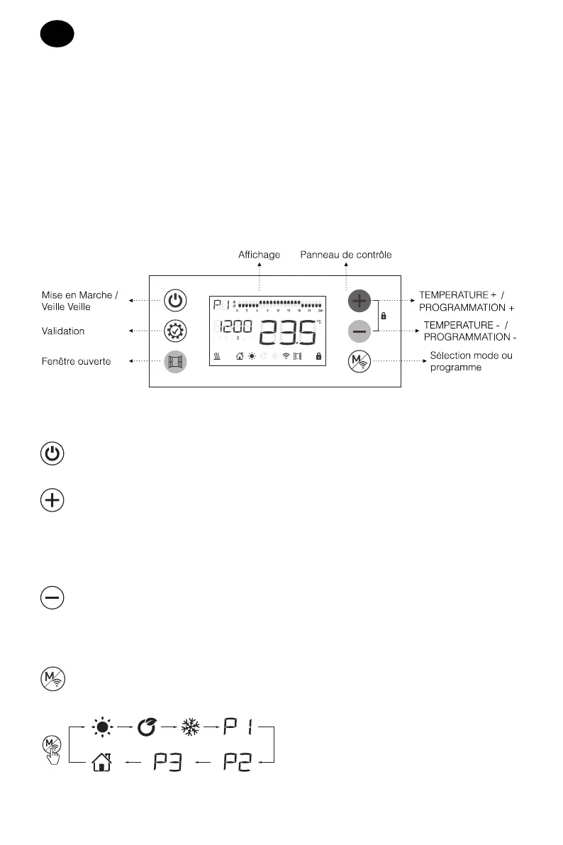 Réglage de la température + : Appuyer sur ce bouton pour une augmentation