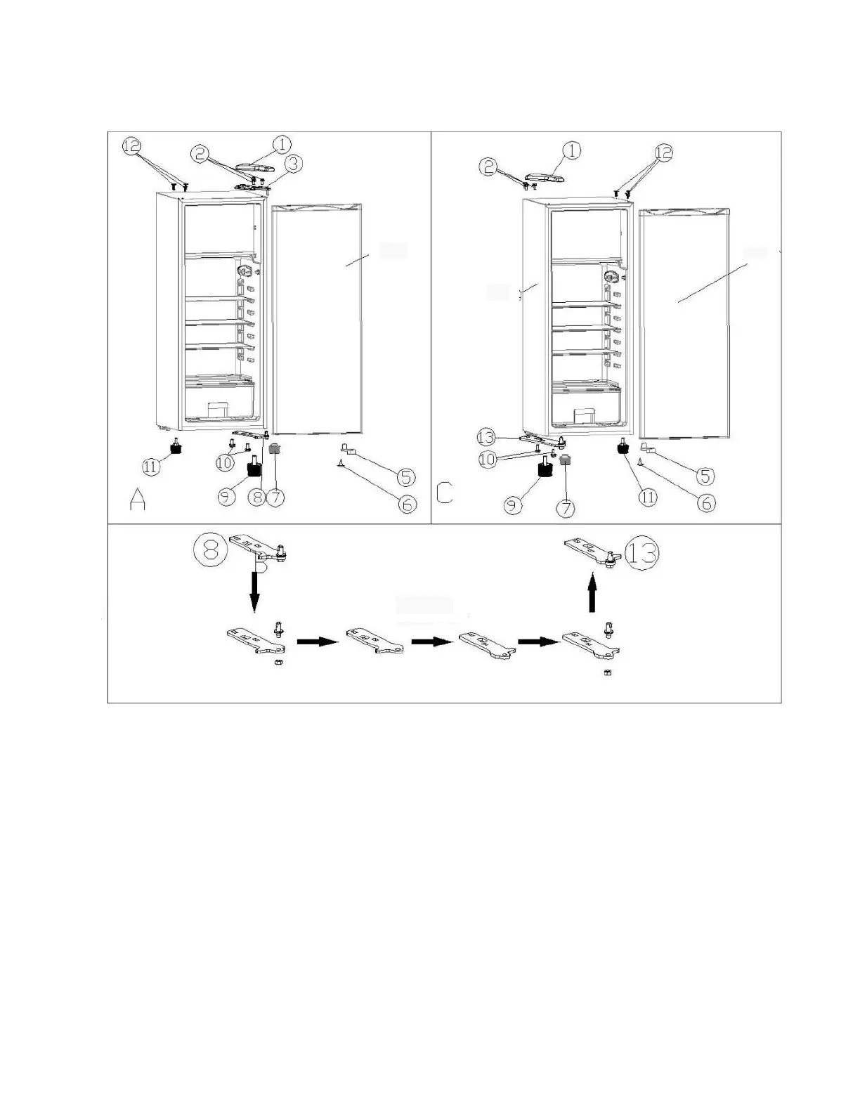 retirez la charnière inférieure ⑧, et retirez les pieds réglables hauts ⑪.