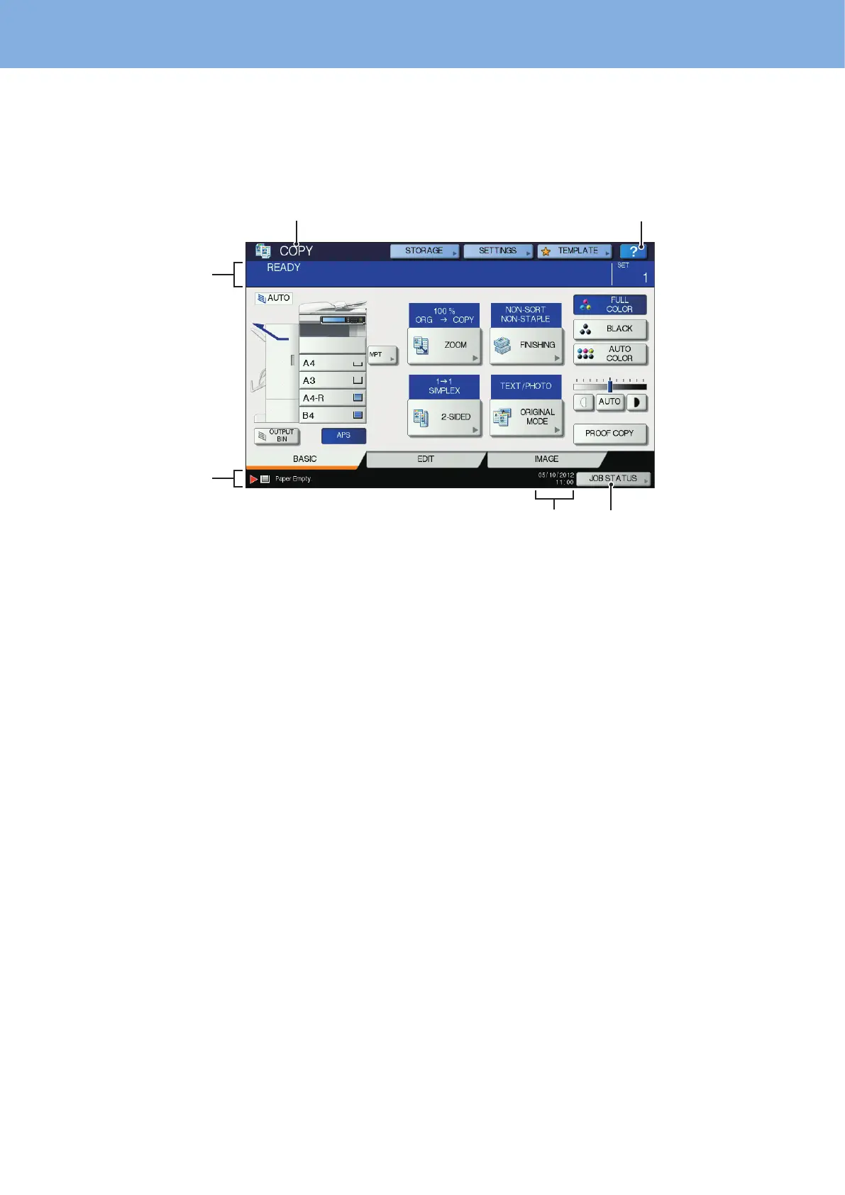 When the power is turned ON, the basic menu for copying functions is displayed on this touch panel. The status of the