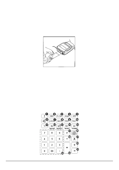 5. Schakel de rekenmachine in en druk op de papiertoets om het papier door te