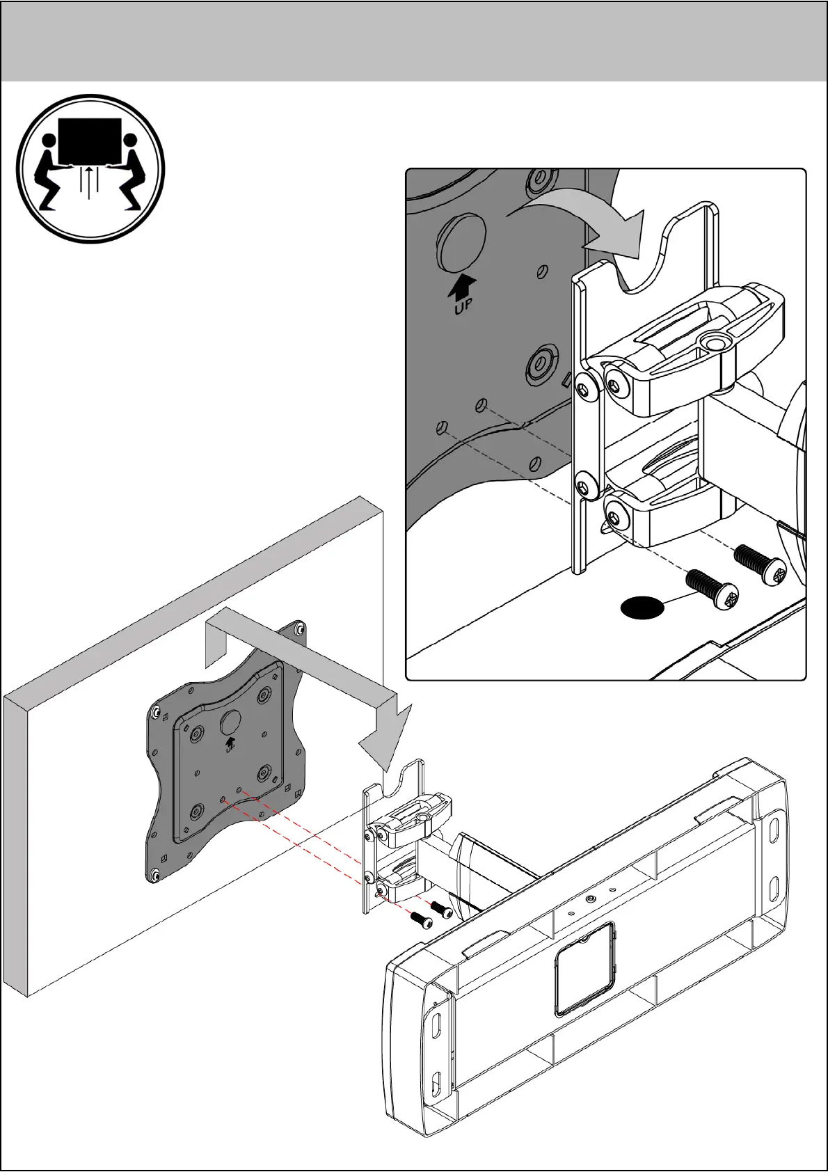 STEP 11: Lift and lock flat panel onto wall plate / arm assembly (Part #1). Tighten hardware (Part P-D) to