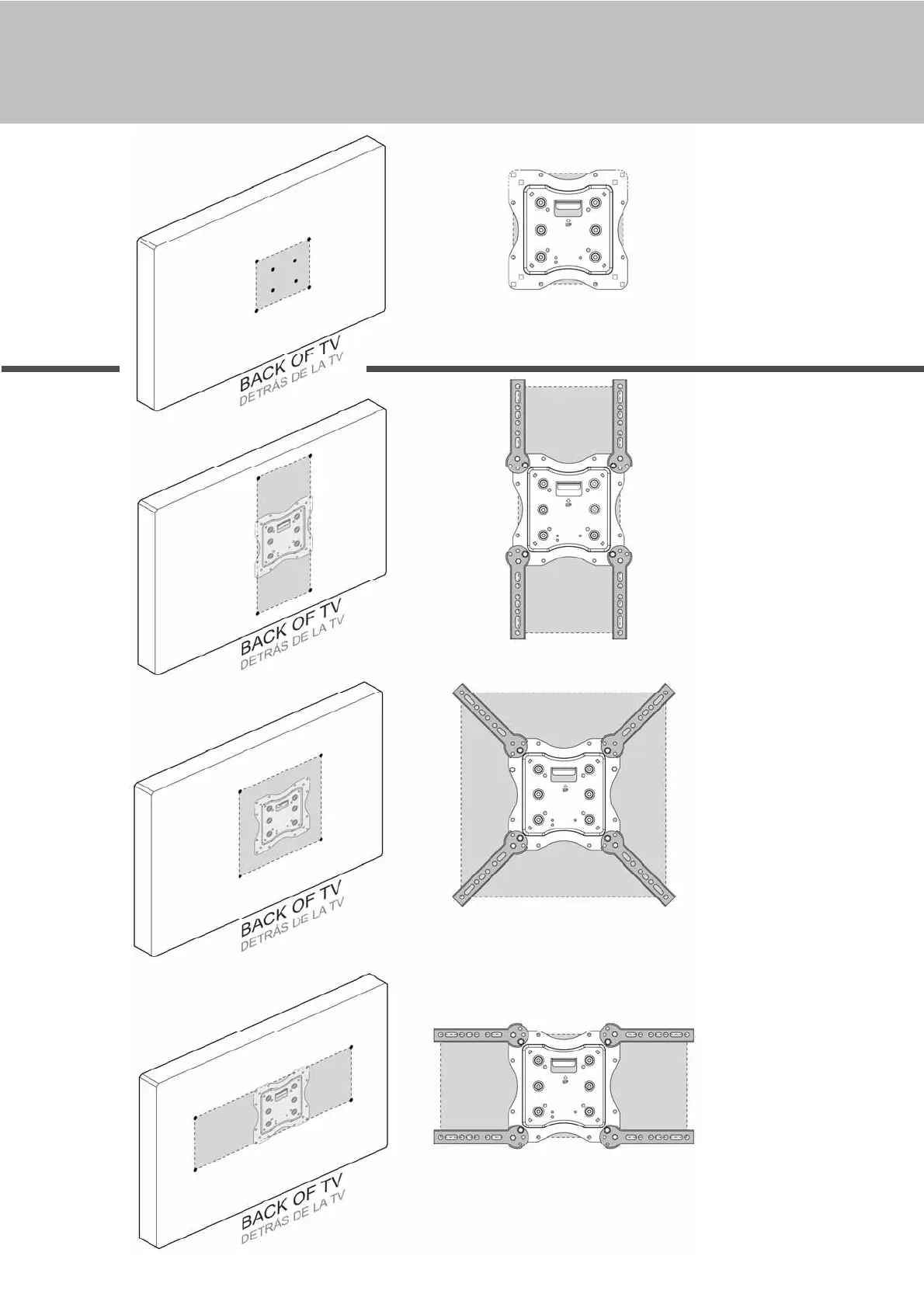 STEP 8: MATCH MOUNTING CONFIGURATION WITH MOUNTING HOLES ON BACK OF FLAT PANEL USING