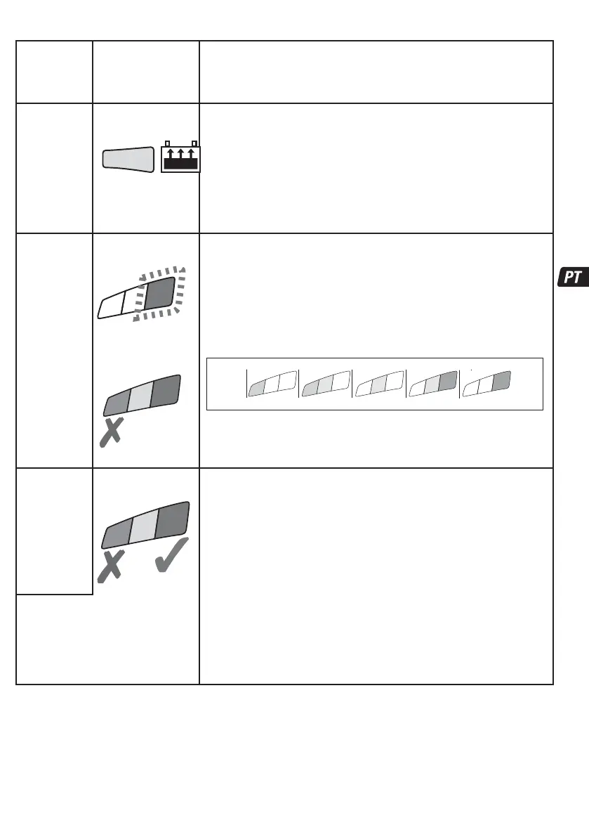 a tensão da bateria medida. Consulte a tabela para corresponder a indicação do LED de