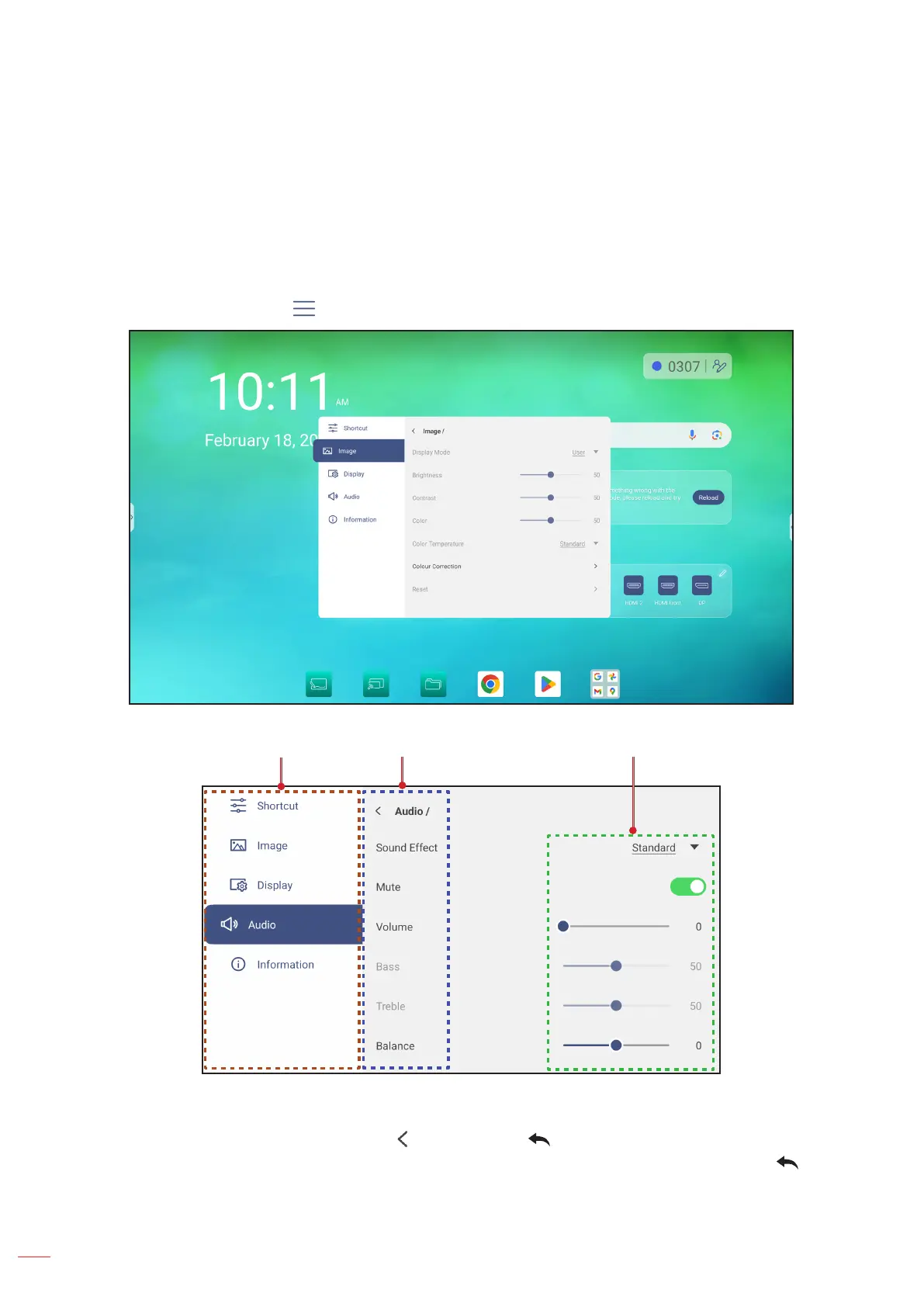 • To close the OSD menu, touch anywhere on the screen outside the menu or press Return