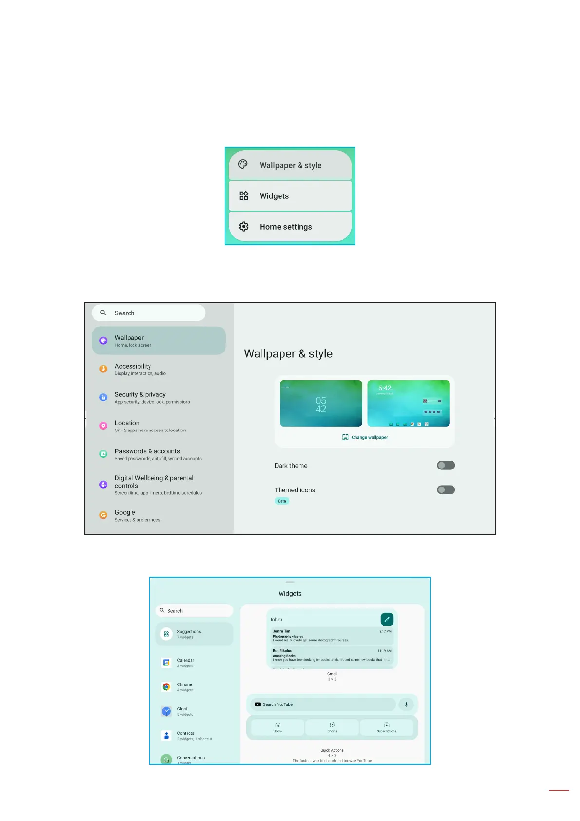 • Tap Wallpaper & style to change the Home screen wallpaper, enable or disable dark theme, themed icons,