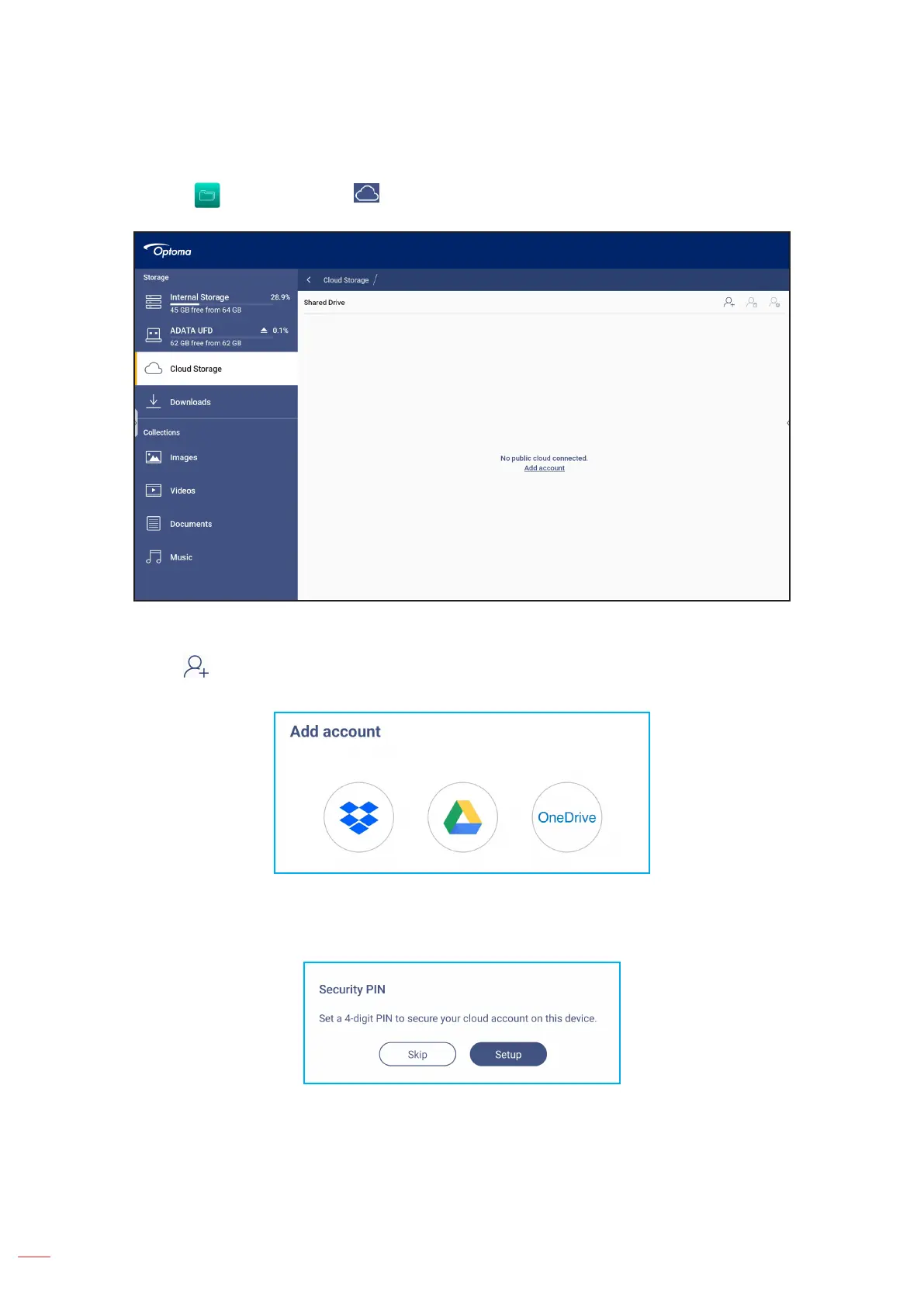 Tap File Manager ⇒ Cloud Storage to create an account or to pair and access an existing cloud storage