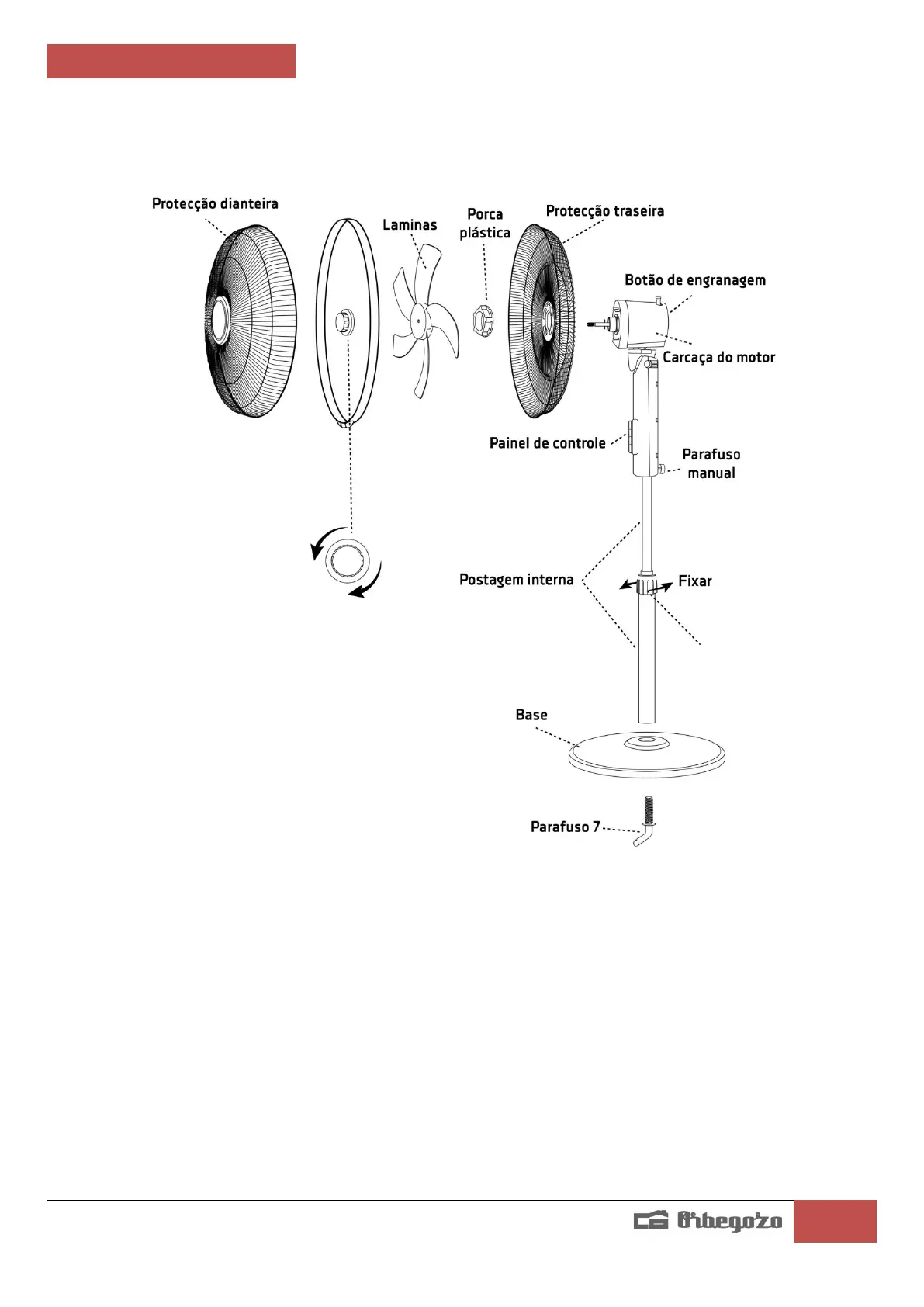 11. Insira o poste interno no corpo do ventilador e aperte o parafuso de aperto manual para