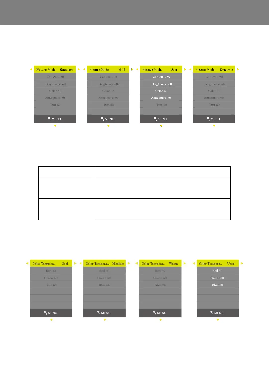 Picture Mode can select 4 modes as Mild, Dynamic, Standard and User as shown in the figure