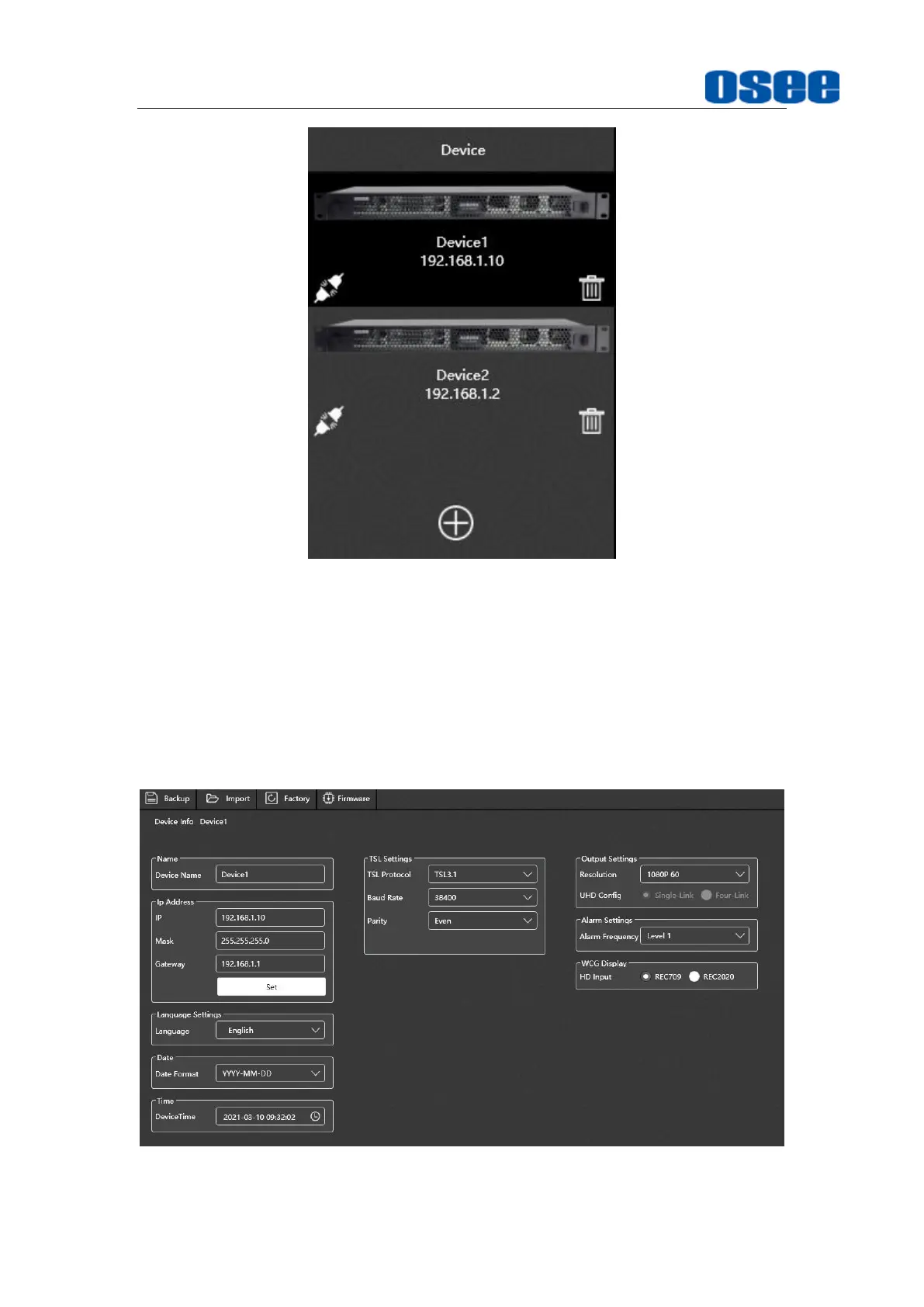 Address, TSL Settings, Output settings, WCG Display, etc.
