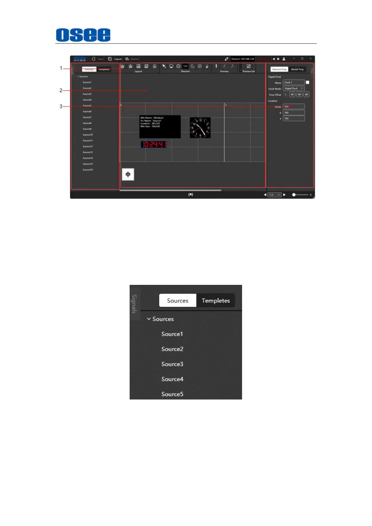 It provides the Sources and Templates list for layout configuration, as
