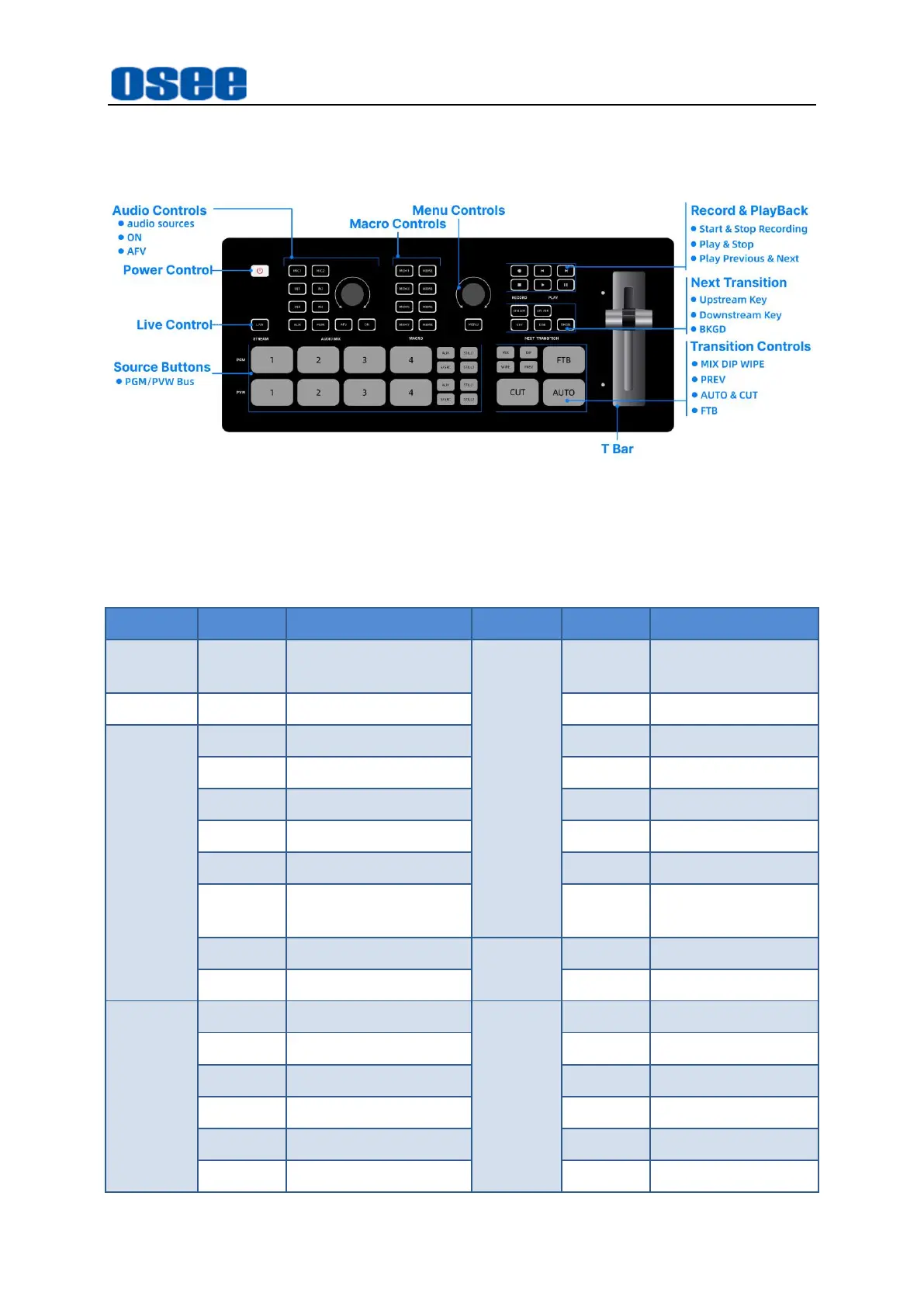 audio mix, macro control, record and play, transition, next transition, live and menu.
