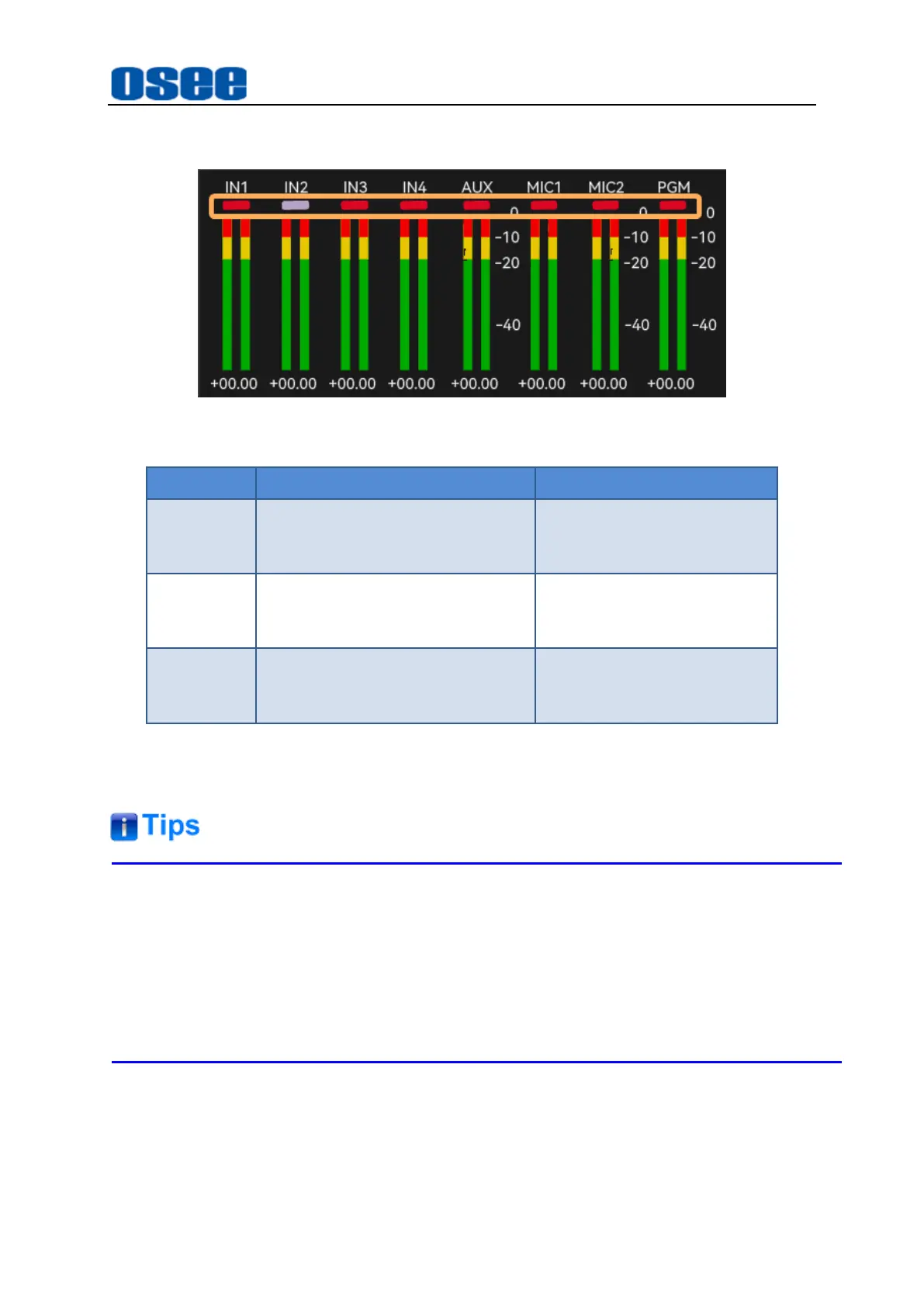 For example: The audio meter for In2 is shown in gray to indicate that its audio