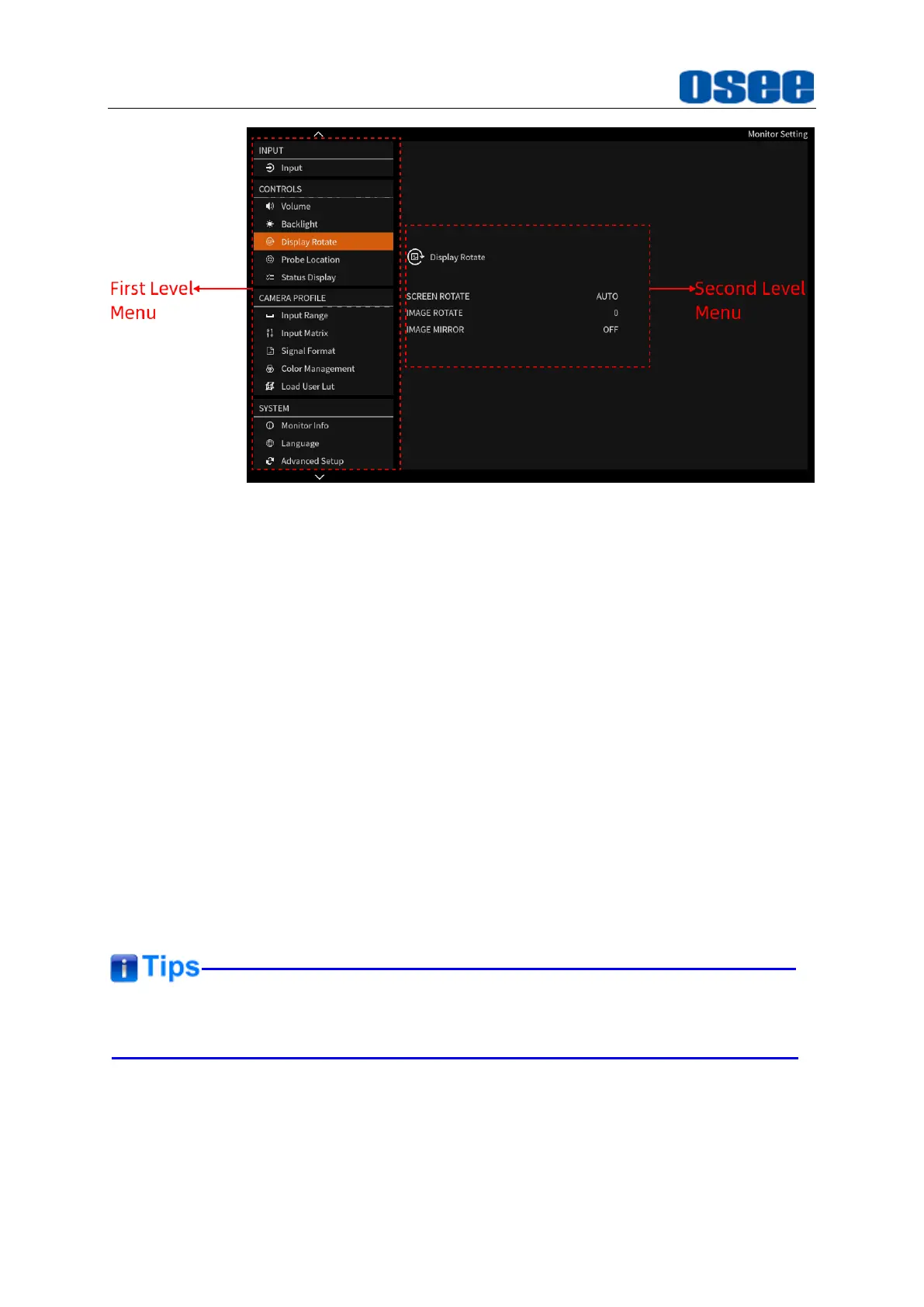 menu list. Scroll up or down to choose the second level item, and scroll left or