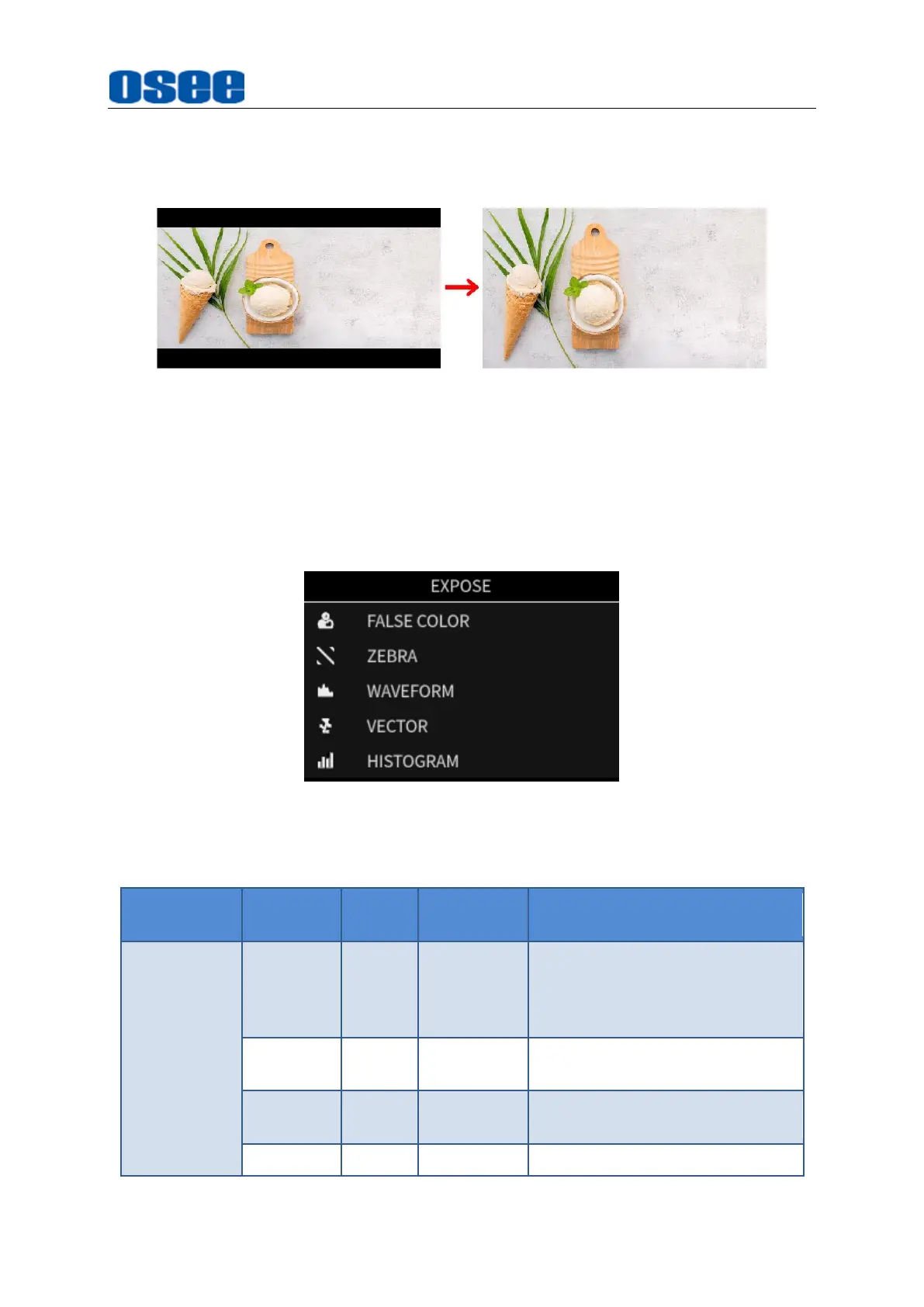 Expose tools provide false color, zebra, waveform, vector and histogram, as shown in