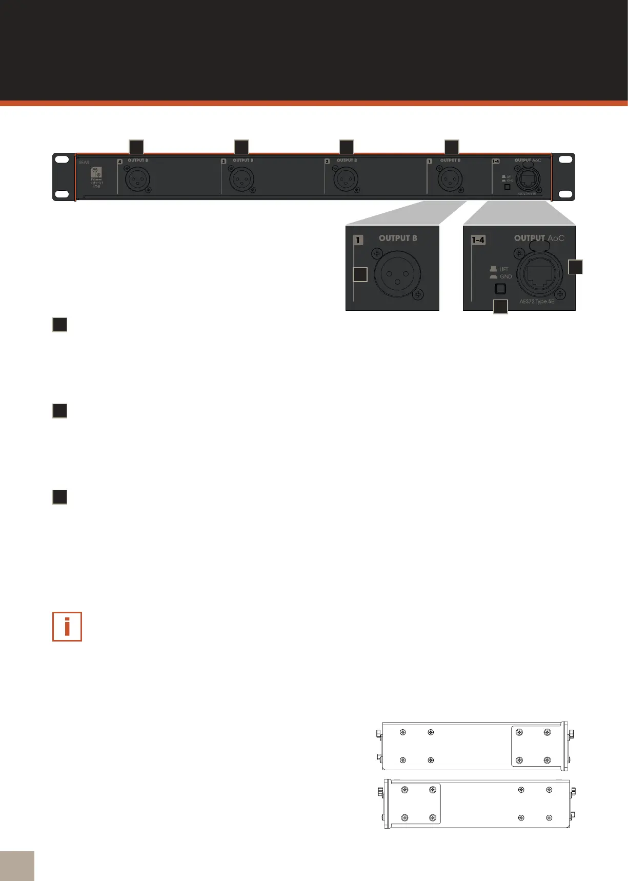 Symmetrische Line-Ausgänge 1 bis 4 mit verriegelbarer Ethercon Buchse (AES72 Type 5E Standard).