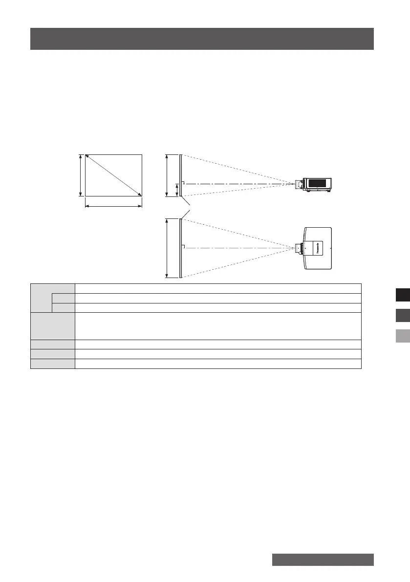 The dimensional relationship between the screen and the projector is shown below.