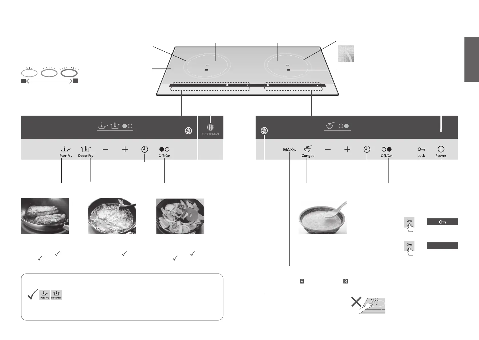 • Touch to set the heat level of the right cooking