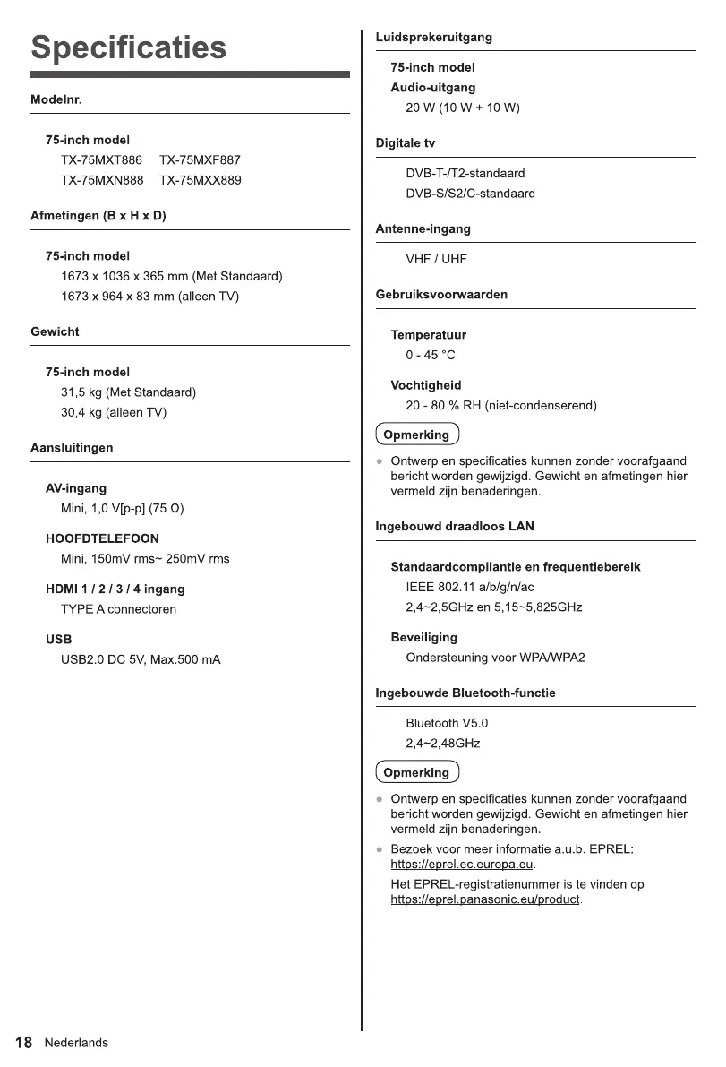 Bekijk gratis de handleiding van Panasonic TX-75MXN888, stel vragen en lees de antwoorden op veelvoorkomende problemen, of gebruik onze assistent om sneller informatie in de handleiding te vinden of uitleg te krijgen over specifieke functies.