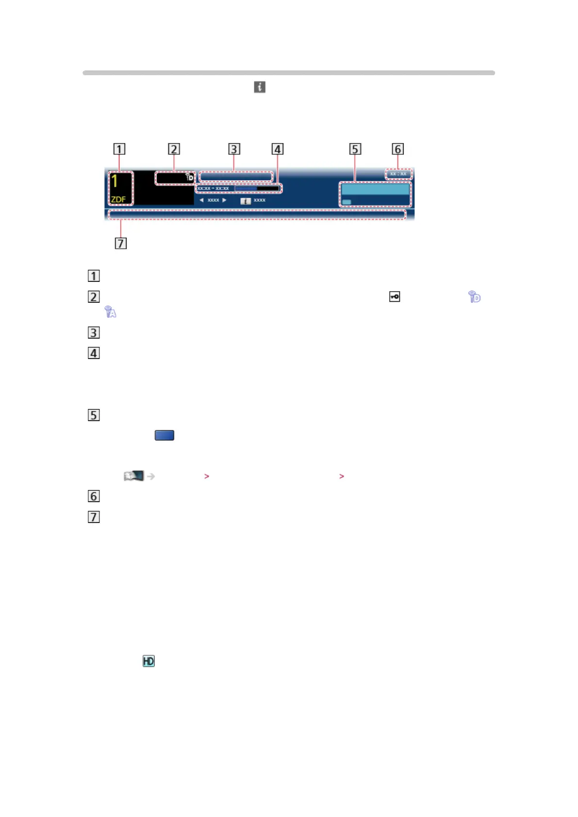 Channel type (Radio, HDTV, etc.) / encrypted channel ( ) / TV mode ( ,