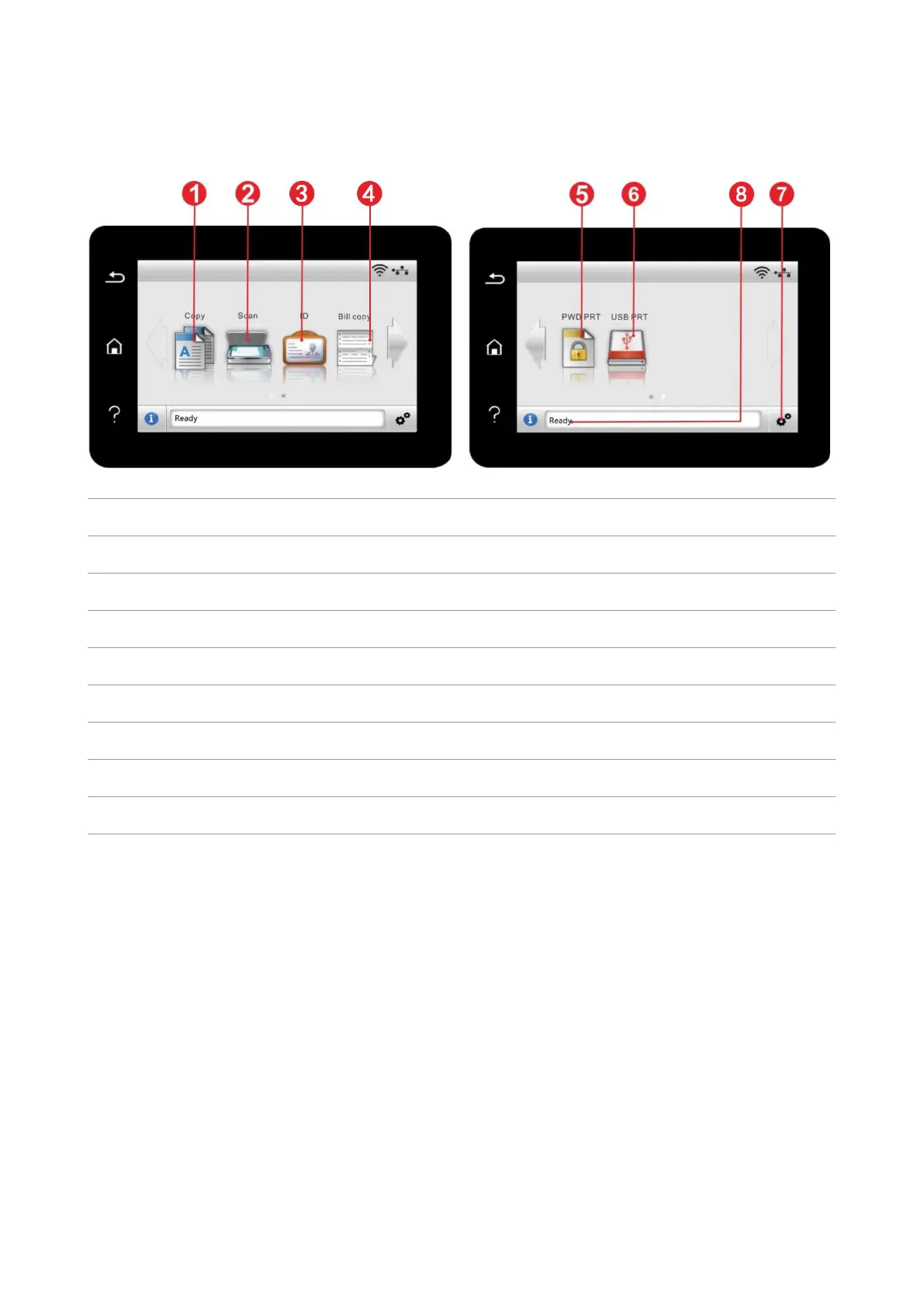Use home screen buttons and icons to initialize print, scan. The layout is shown as below: