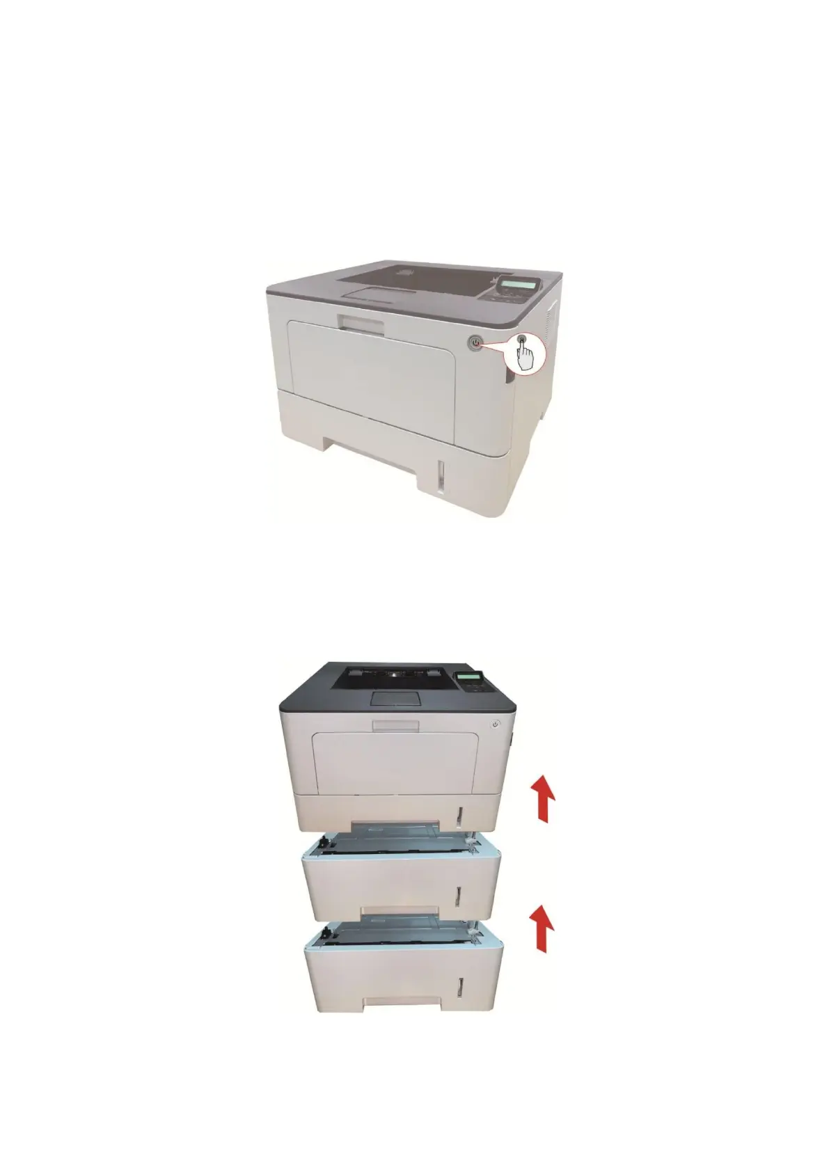 4. Make sure the printer body and optional trays are placed correctly, as shown in the figure below.