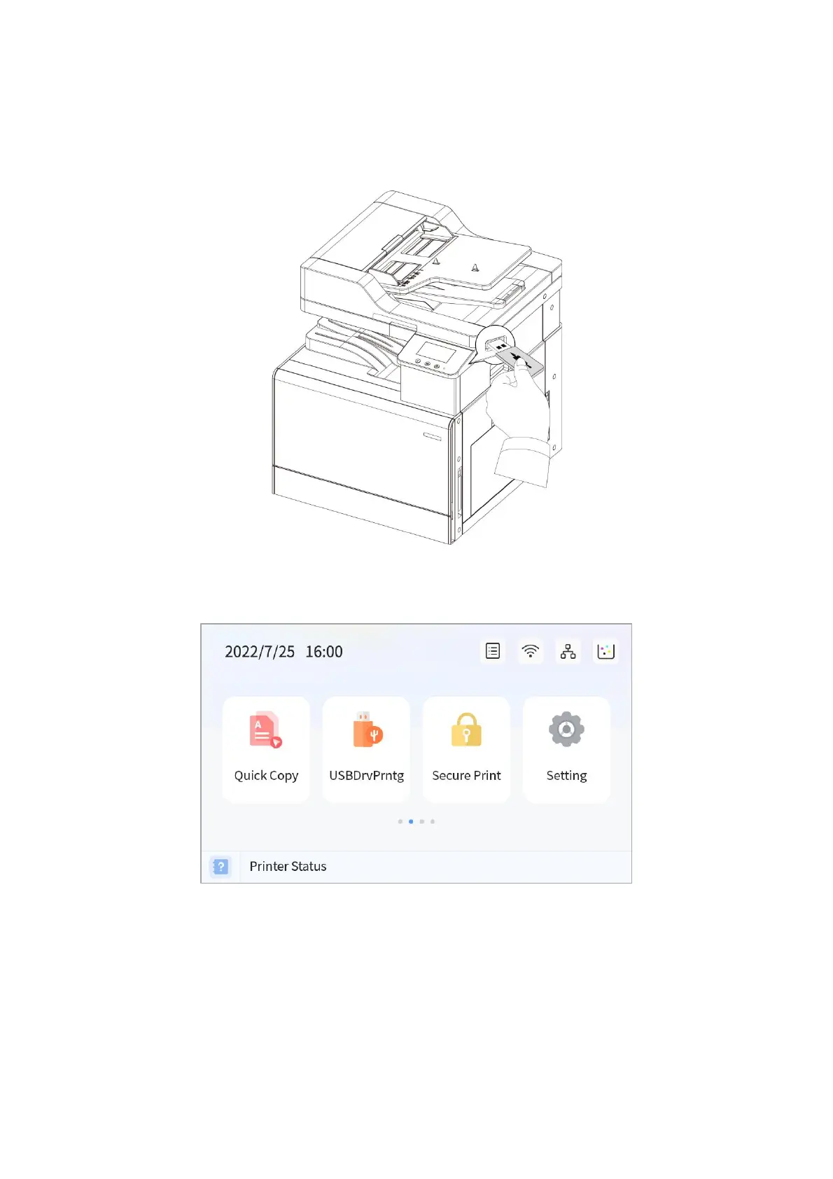 1. Insert the USB stick into the front USB disk interface of the printer.