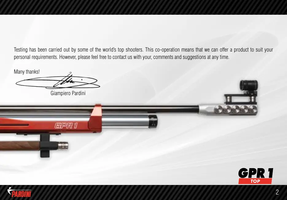 Congratulations and thank you for choosing to shoot a Pardini rifle. Your rifle has been designed and developed by a succesful shooter