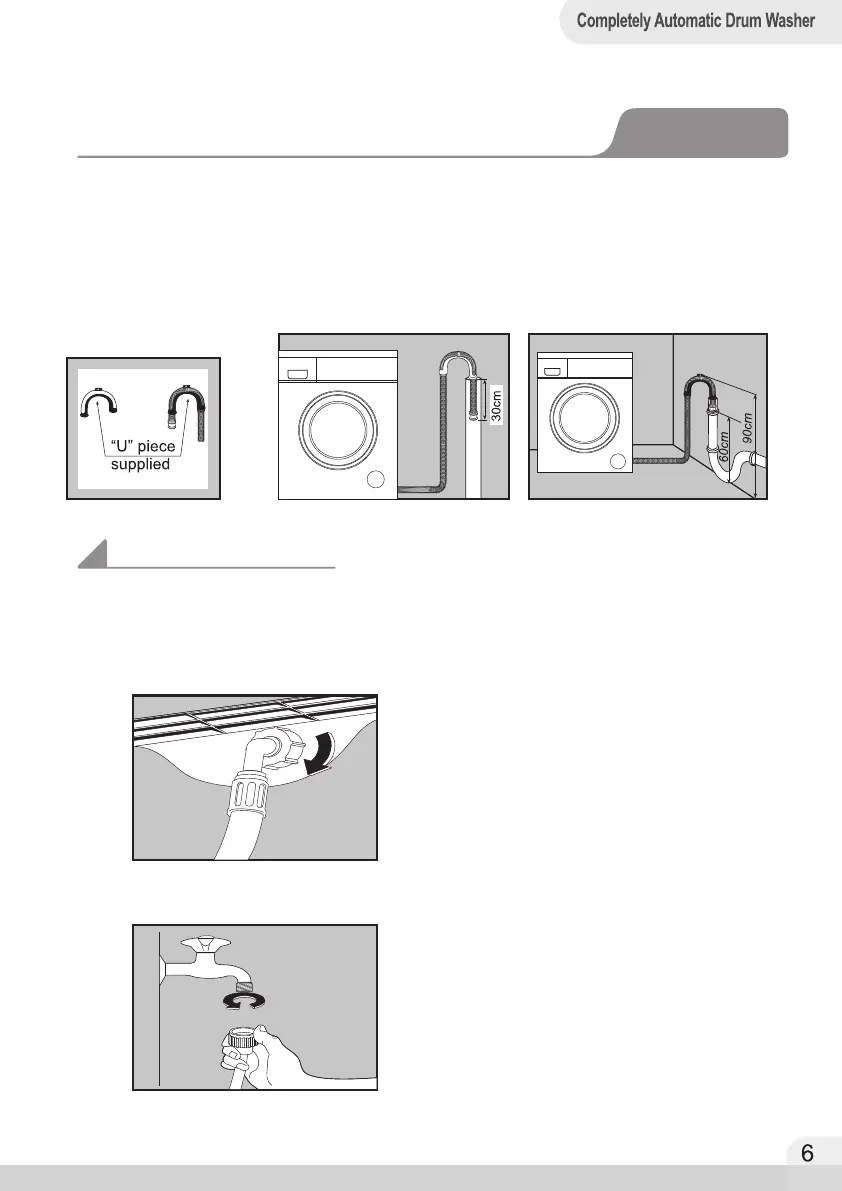 Firstly form a hook in the end of the drain hose using the “U” piece supplied.