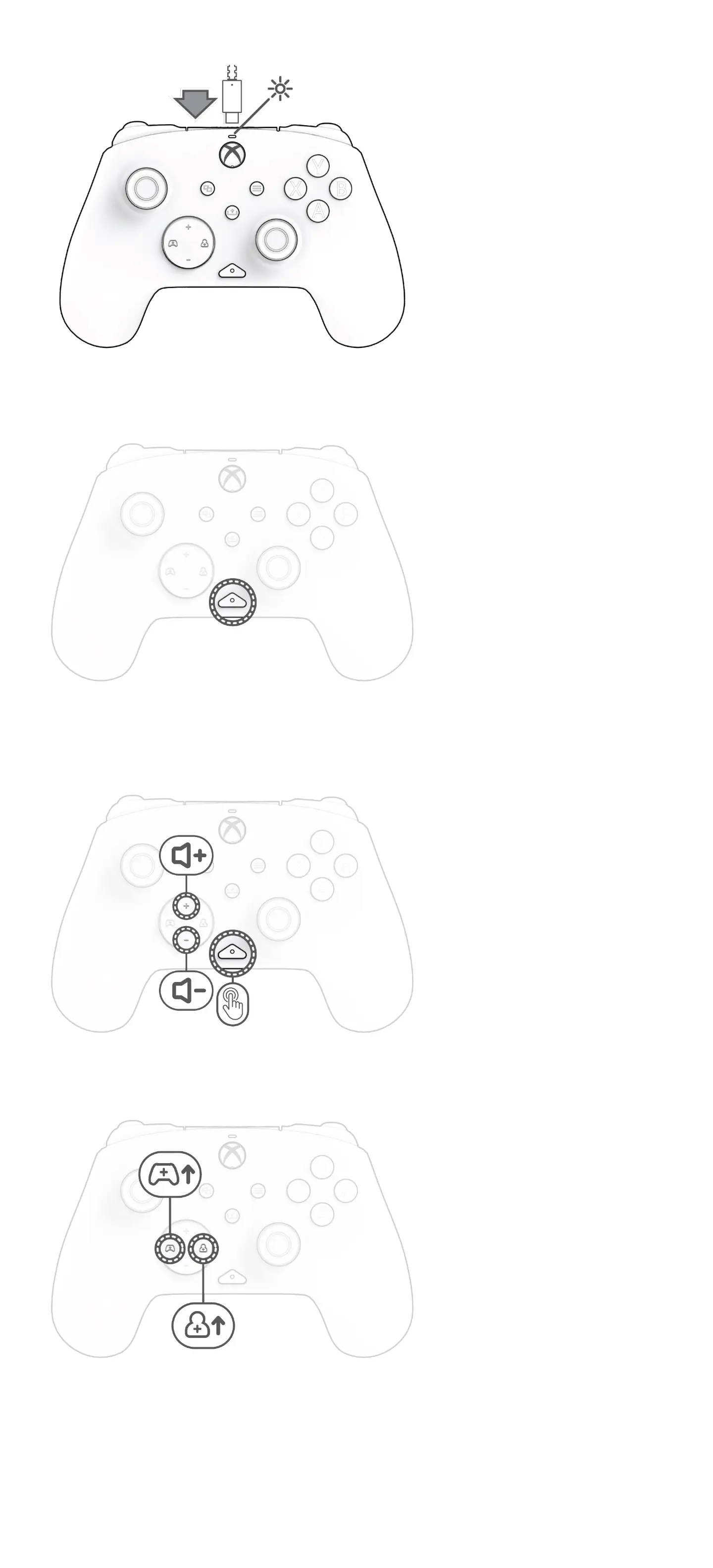 Inserire l’estremità USB-C del cavo nella parte superiore del controller e il lato USB nella console o nel PC. Comparirà la luce sopra il logo Xbox per