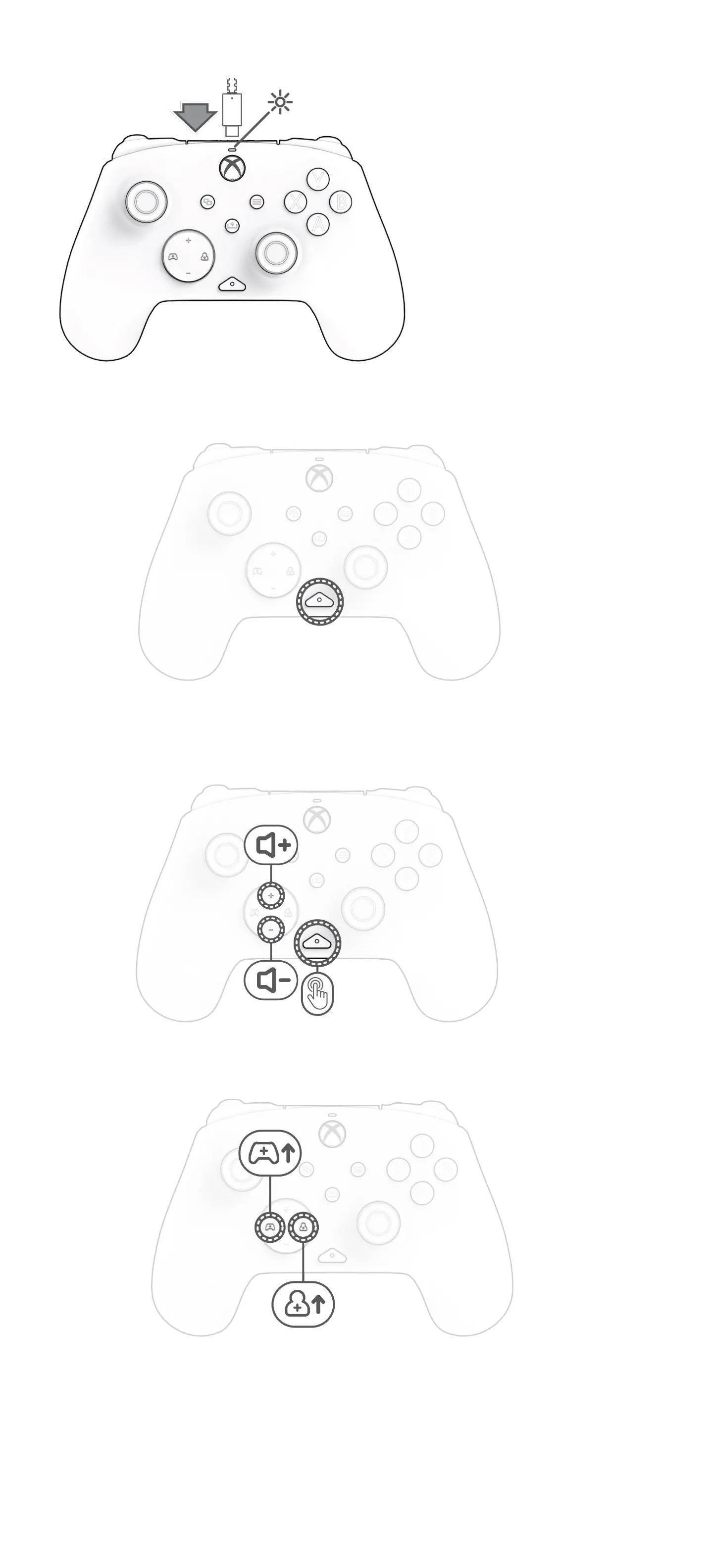 Schließe das USB-C-Ende des Kabels oben am Controller an und die USB-Seite an deiner Konsole oder deinem PC. Sobald das Licht über dem Xbox-Logo