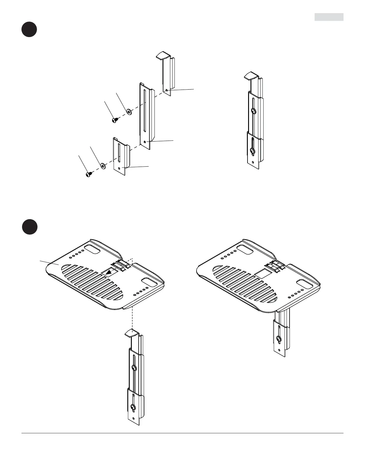 arandelas (F) como se muestra. NOTA: No apriete los tornillos (E) hasta el paso 3.