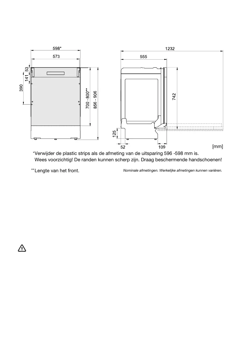 Verwijder de plastic strips als de afmeting van de uitsparing 596 -598 mm is.