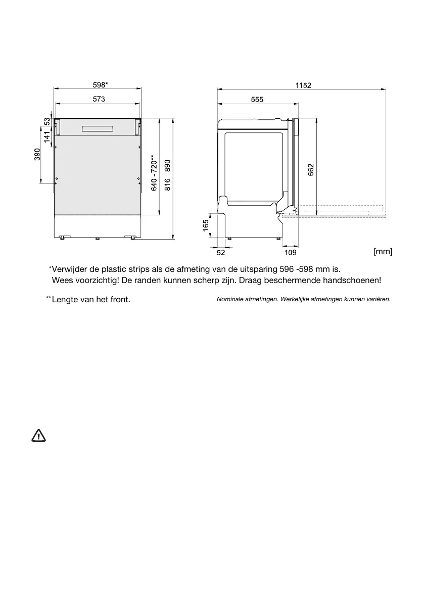 Verwijder de plastic strips als de afmeting van de uitsparing 596 -598 mm is.