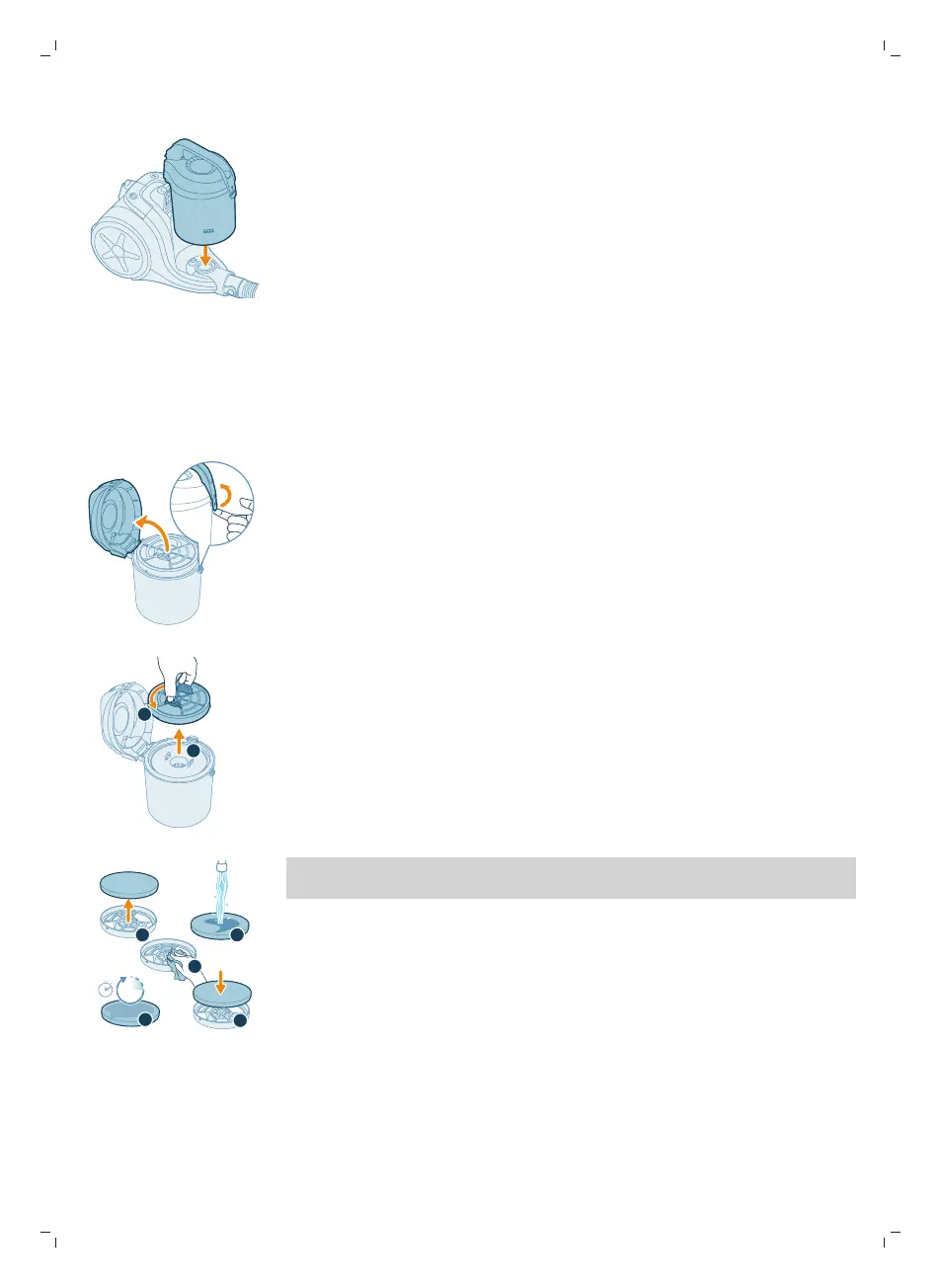 8 Riposizionate il contenitore della polvere nell'apparecchio.