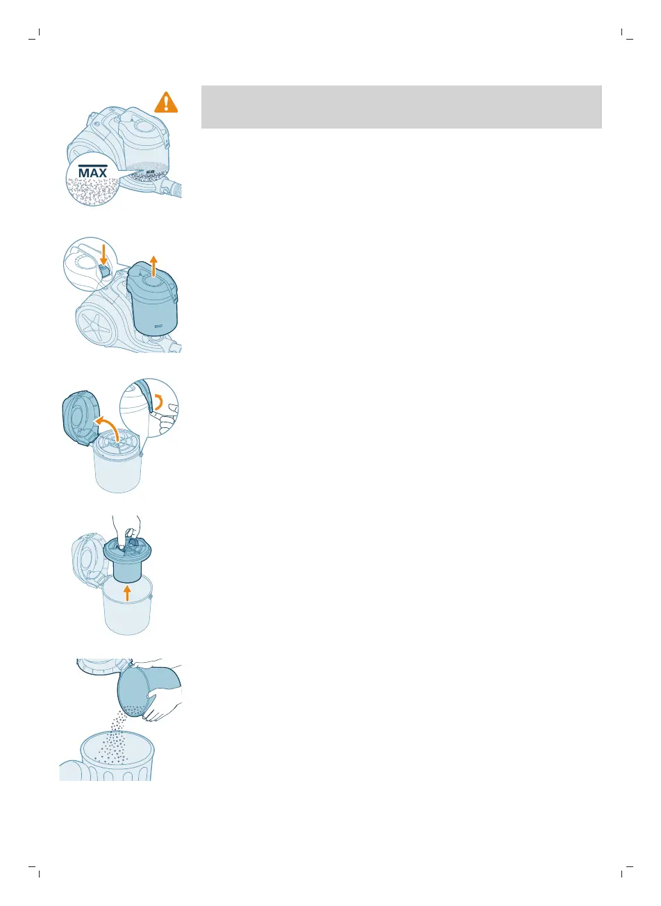 tvertni. Vienmēr iztukšojiet putekļu tvertni, kad putekļi sasniedz maksimālo