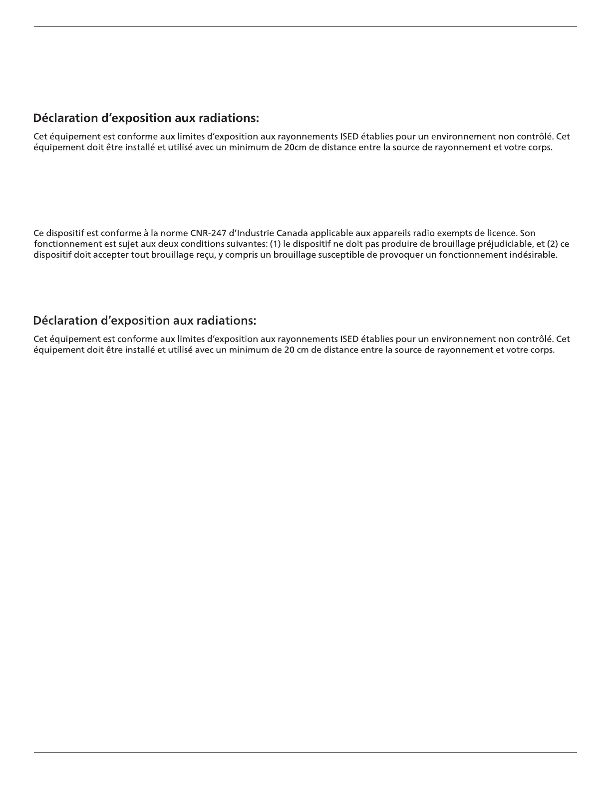 本設備遵守 FCC/ISED/CE-RED 在非受控環境的輻射暴露限制。本設備應於輻射體和您人體間至少相隔 20cm 的前提下進行安裝和運轉。