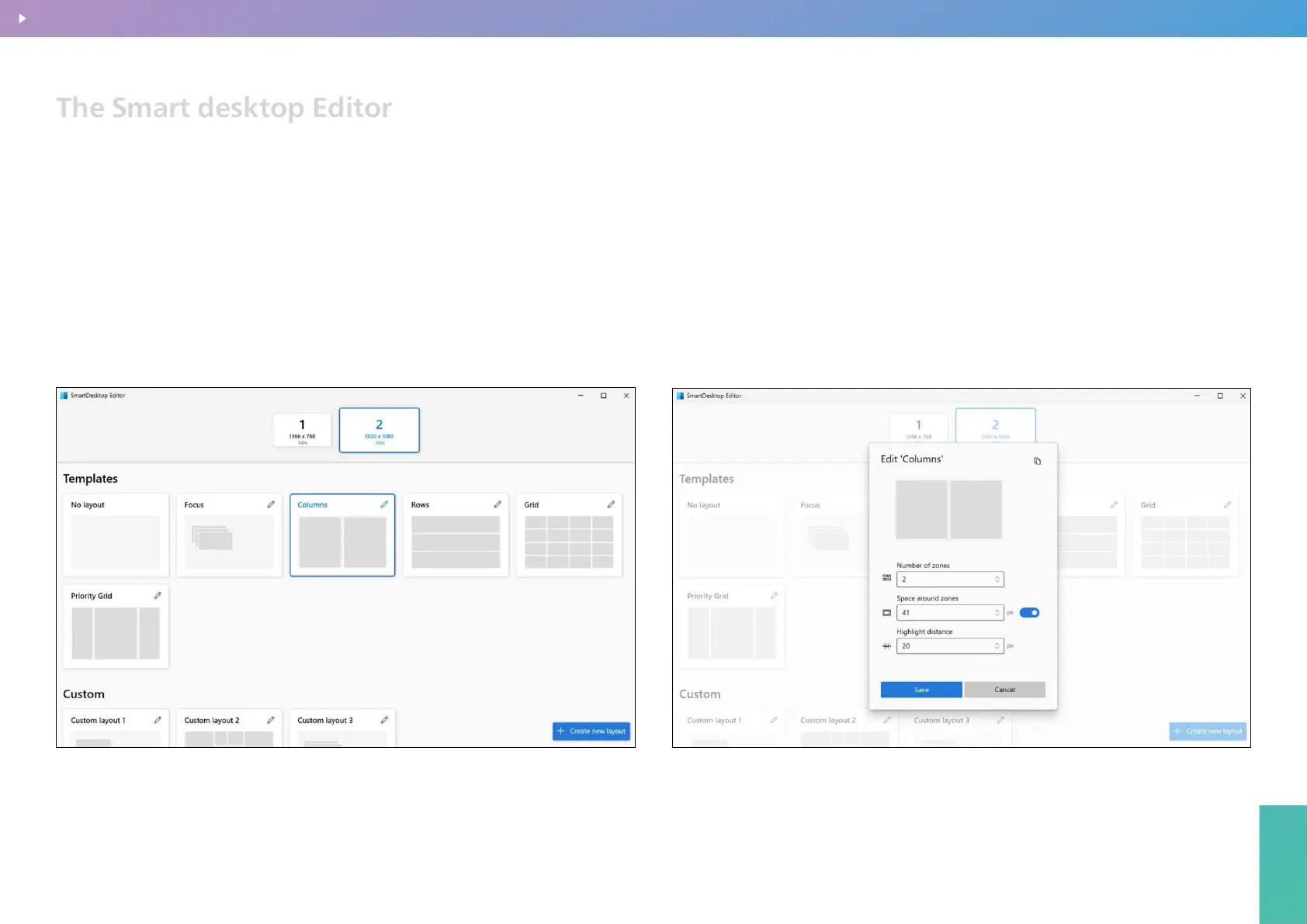 III. The Zone Editor displays a list of layouts that can be adjusted according to the