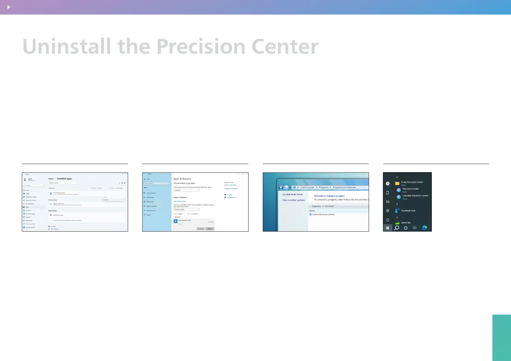 You can uninstall the Precision Center application by following the steps for your Windows version: