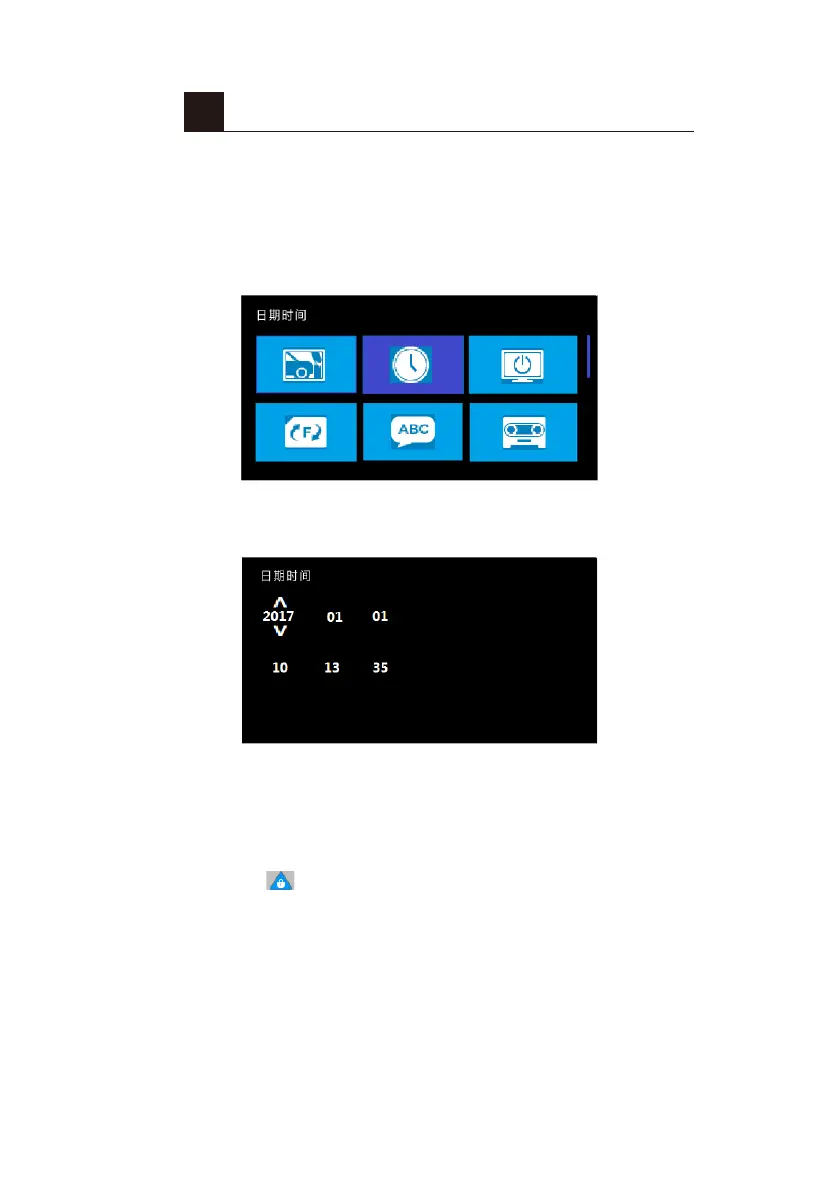 2. 轻压 ▲/▼ 选择时钟图标并按 OK 按键进入日期/