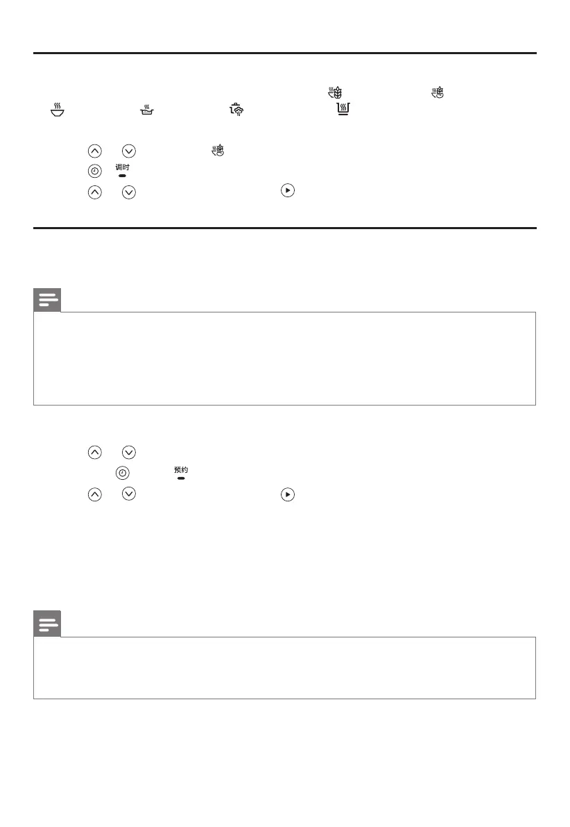 • 所设的预约时间必须长于或等于烹饪时间,如果等于烹饪时间,则立即开始