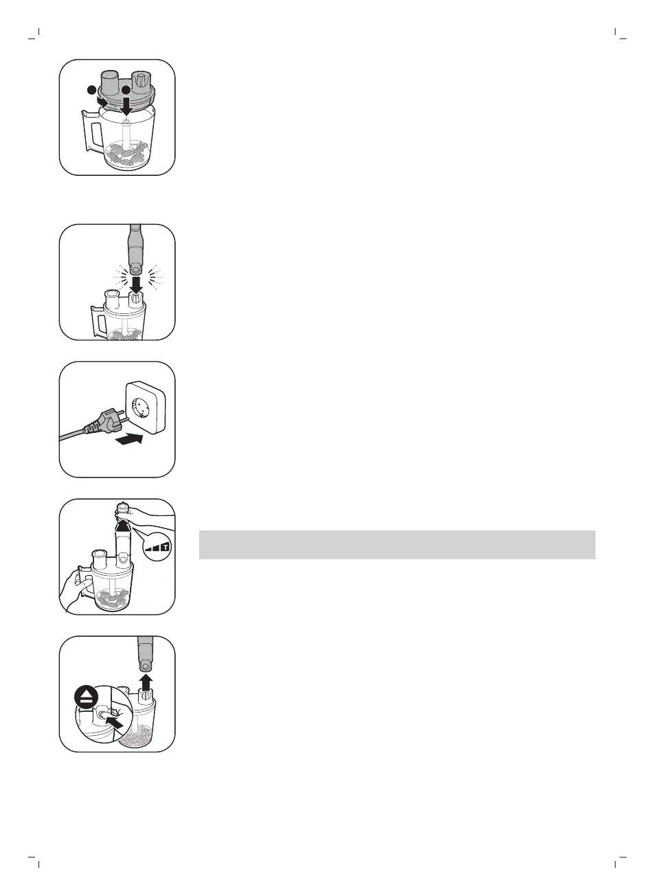 3 Ponga la tapa del robot de cocina en el recipiente y gírela hacia la izquierda