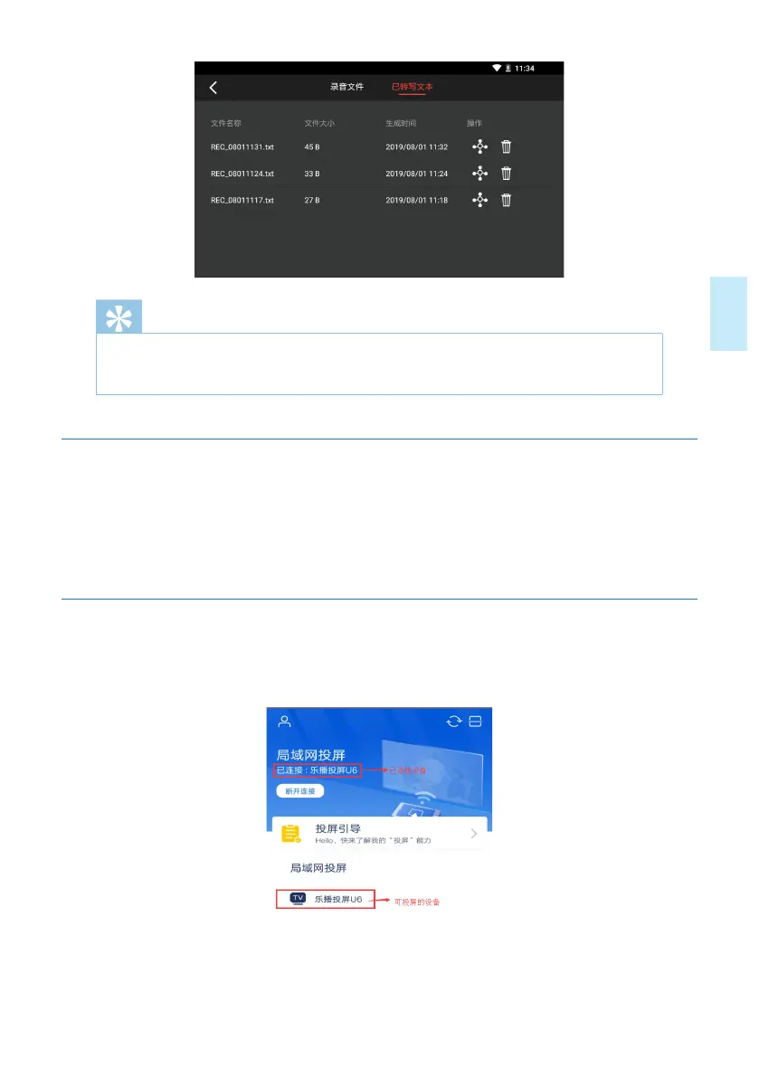 通过局域网的方式将手机屏幕内容投屏到产品上。首先在本产品的主界面“应用