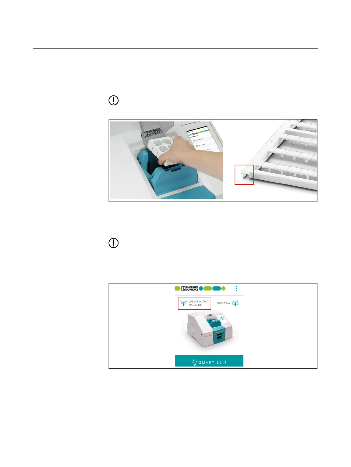 不得尝试强行将出料盒拉出。否则可能导致材料或设备损坏。在插入时,应该可以