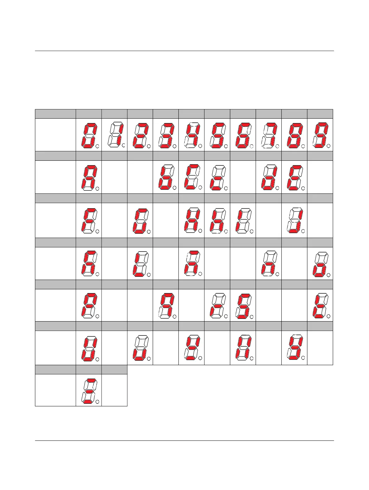 Reference table for the seven-segment digital control panel LED display