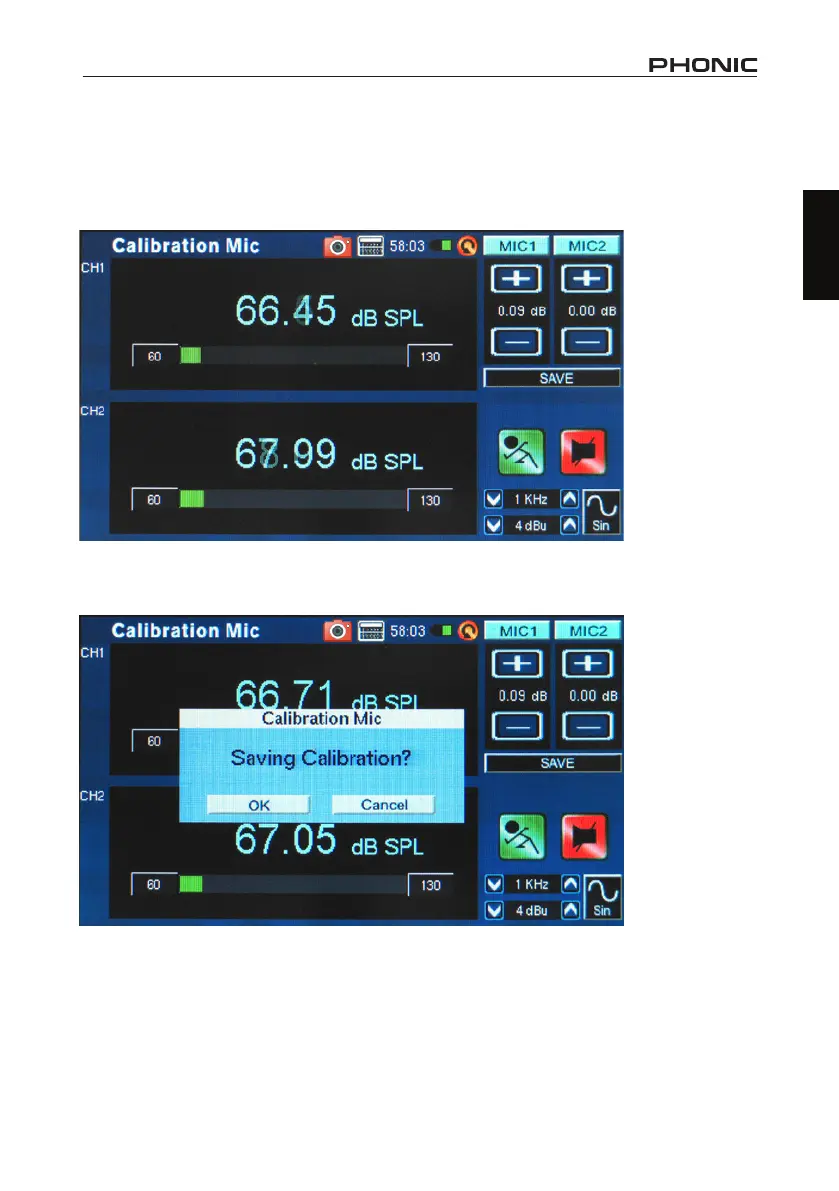 4. Adjust the level measured from the SPL calibrator by pressing “+” and “–“ buttons until the level is