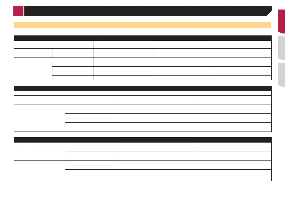 The settings and cables required for connecting each device, and the available sources are as follows.