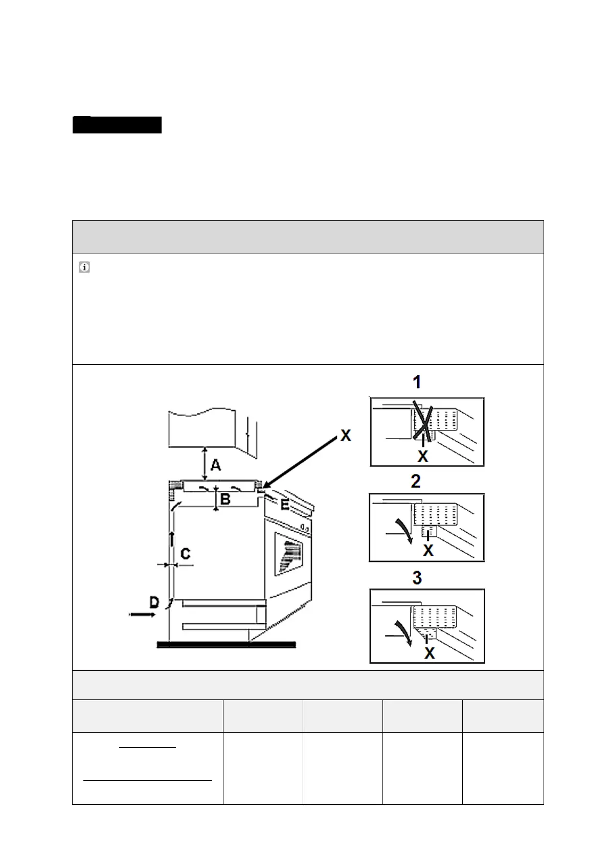 Abschlusskante des Einbaumöbels (X) darf nicht direkt an die Einbauöffnung