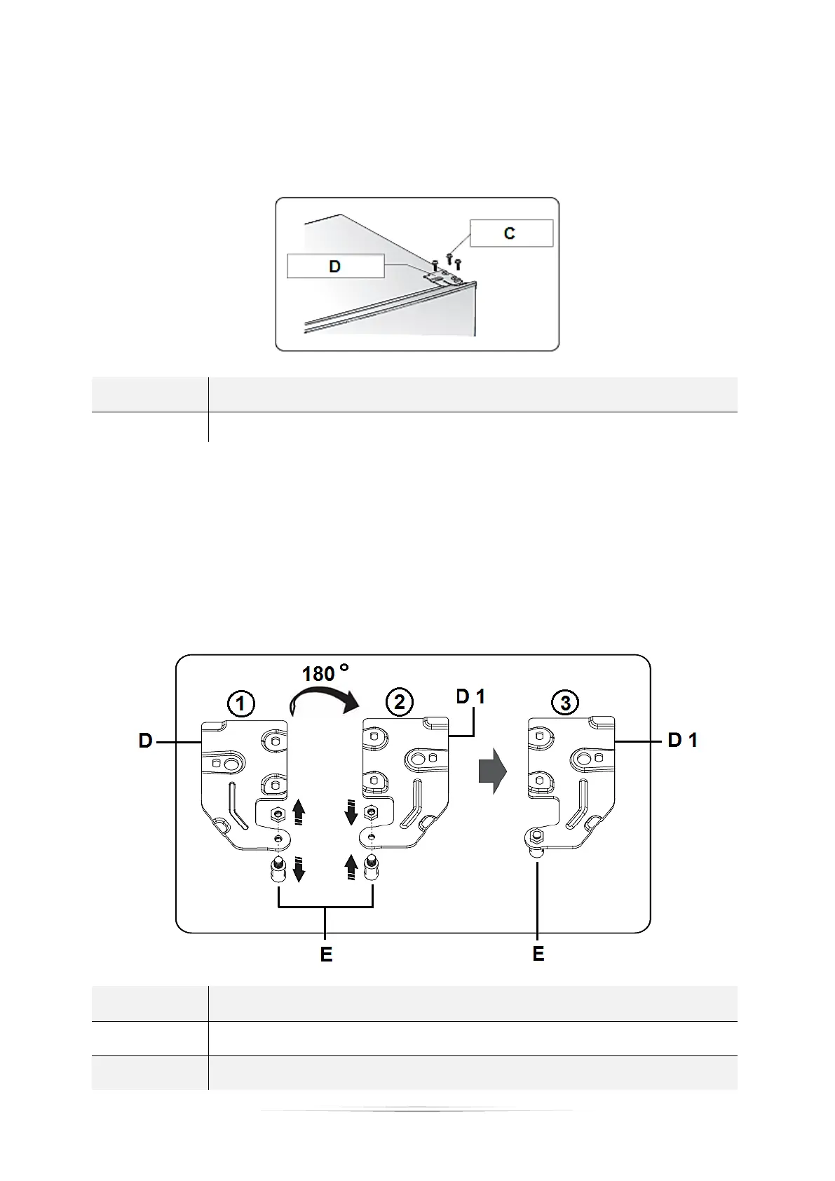 6. Unscrew the self-tapping screws (C) of the upper door hinge (D) using an